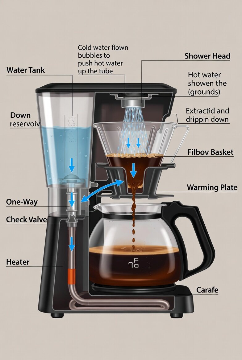 A detailed cross-section illustration of a drip coffee maker showing its internal mechanism and how it works. Cutaway view revealing: water reservoir on the side, one-way valve, aluminum heating tube at the bottom with heater coil, rising hot water tube (riser tube), shower head distributing hot water evenly over coffee grounds in the filter basket, brewed coffee dripping into the carafe below on a warming plate. Include arrows showing the flow: cold water flowing down to heater, heating causing bubbles to push hot water up the tube, hot water showering the grounds, extraction and dripping down. Labeled parts in English: Water Tank, Heater, Check Valve, Riser Tube, Shower Head, Filter Basket, Carafe, Warming Plate. Clean vector style, educational diagram, colorful yet clear, side view, high resolution.