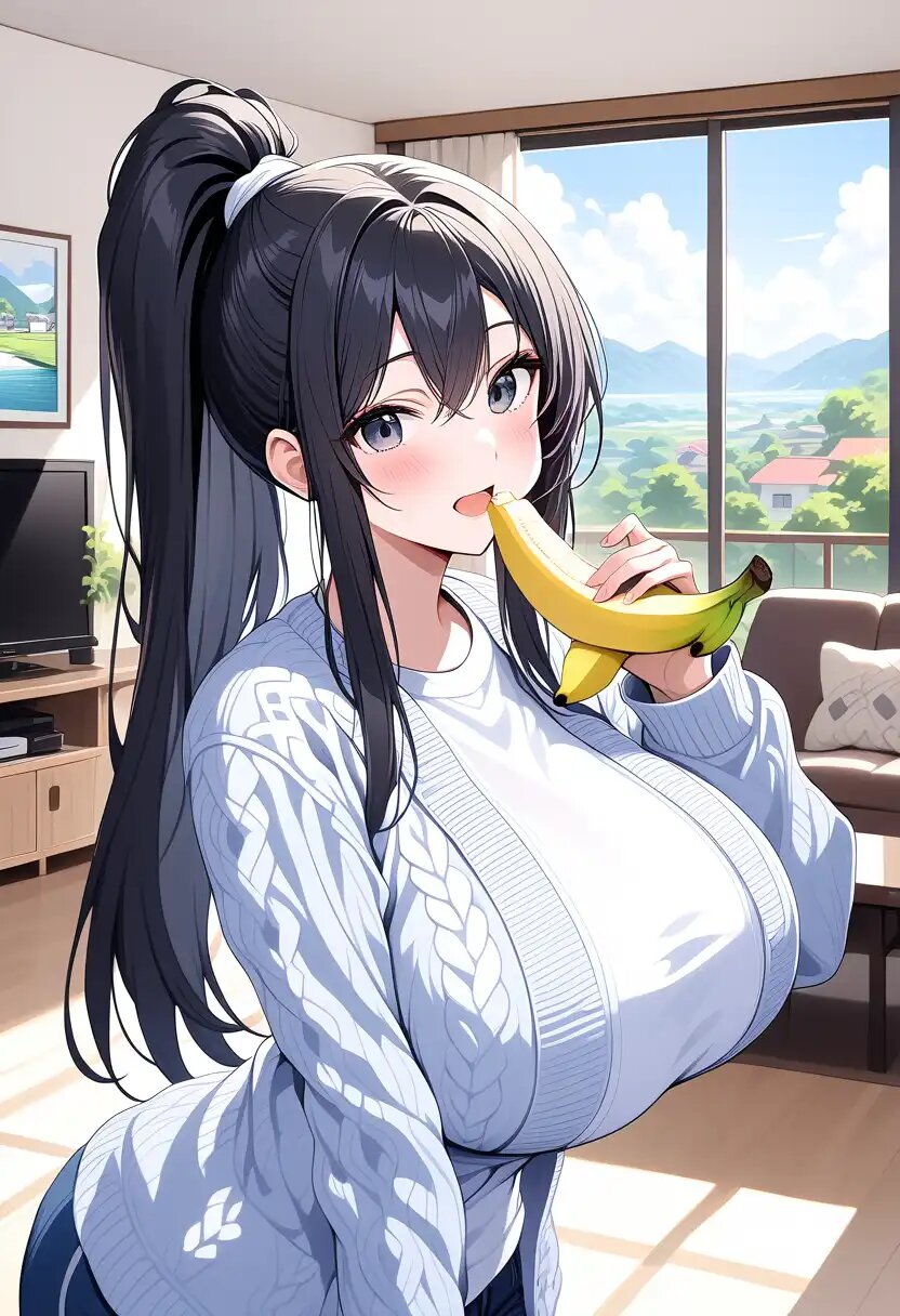 masterpiece, best quality, ultra detailed, 8K, [eating banana]++, [holding banana]++, [open cardigan]++, [cable knit]+, [upper body]++, [huge breasts]++, perky breasts, hanging breasts, curvy, long sleeves, standing, tall, [long hair]++, [straight hair]++, [shiny]+, [shiny skin]+, [shiny clothes]+, smile, blush, open mouth, living room, indoors, day, glass door, scenery, [high ponytail]++, [ponytail holder]++,