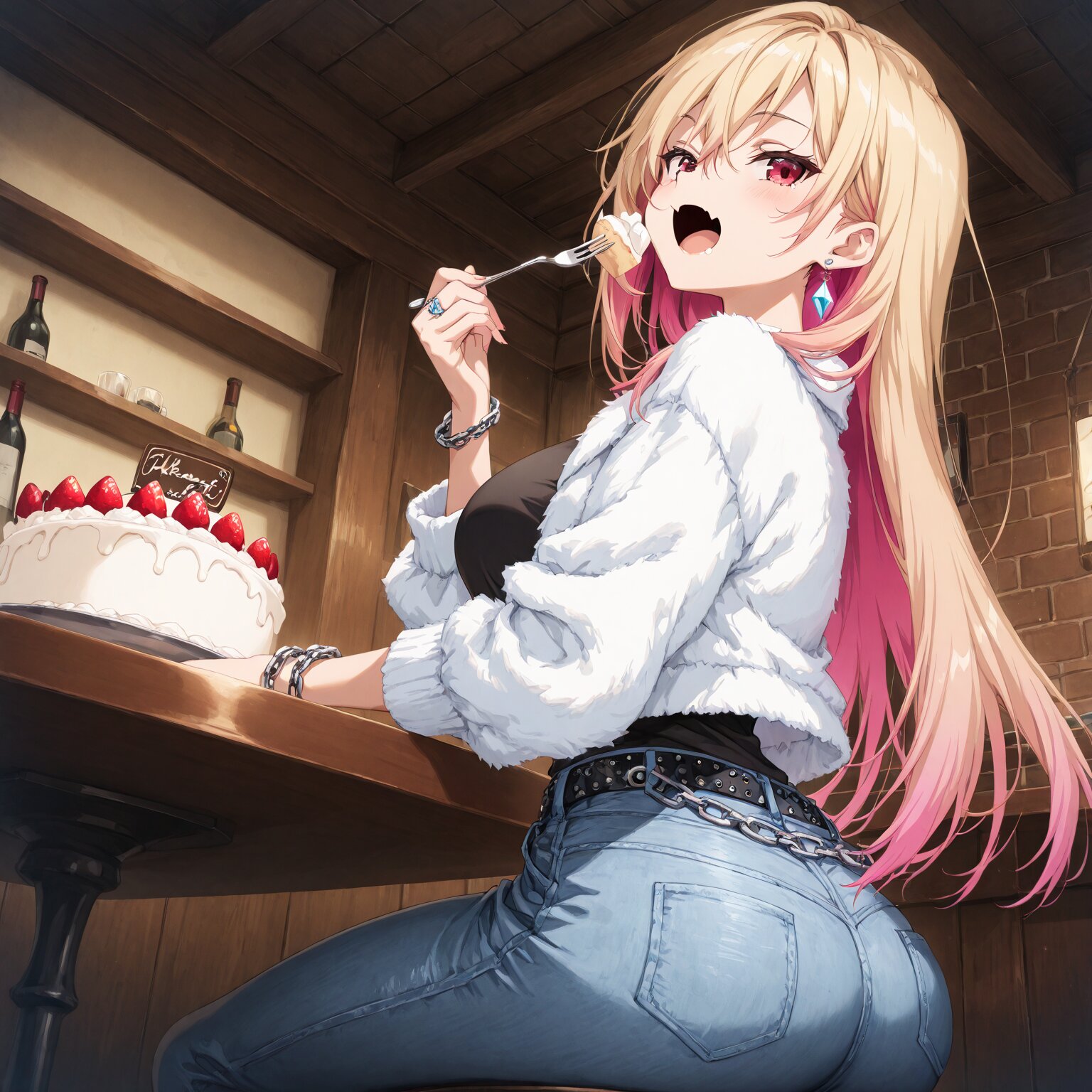 (1girl), young female, BREAK, Blonde, (long hair:1.2), (Straight Hair:1.3), (sharp bangs:1.3), long bangs, Long sideburns, (pink inner hair:1.2), (gradient hair from blond to pink:1.3) BREAK, red eyes, slanted eyes, Highlights, beautiful eyes, beautiful pupils BREAK, slender, shiny body, shiny skin, (full breasts:1.3), Tight, tight waist, toned body, narrow waist, athletic body, (muscular abs, abs:0.8), muscular BREAK, ((diamond-shaped earrings)), chain belts, chains, chain accessories, Chain bracelet, ring, , ((skin fangs)) (Black fur jacket), denim shorts, distressed jeans, focus on buttocks. Cake on the table, table, wine, holding a fork, eating cake. Sitting, bar, cafe From behind, rear view, from below BREAK, (newest, anime, animation, anime screen capture, anime style:1.3) BREAK, (masterpiece, , vibrant, very aesthetic, highly detailed, best quality, 16k:1.3) perfect fingers,