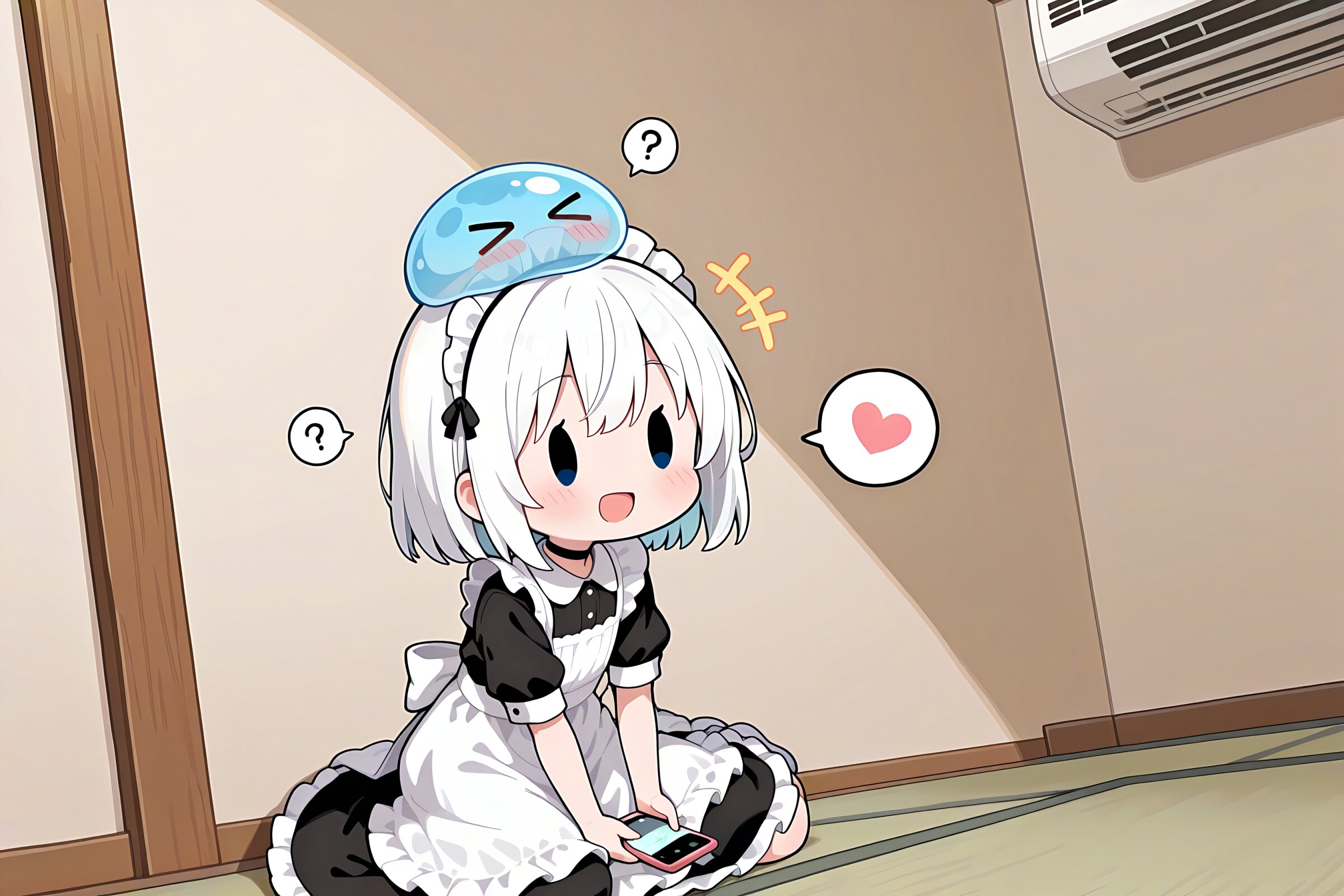 1 little girl, solo, upper body, diagonal angle, masterpiece, best quality, amazing quality, very aesthetic, white hair, short hair, (solid oval eyes:1.2), open mouth, smile, cheerful, blush, +++, notice lines, choker, maid outfit, long skirt, holding smartphone, spoken question mark, slime on her head, wariza, > <, air conditioner, japanese room,