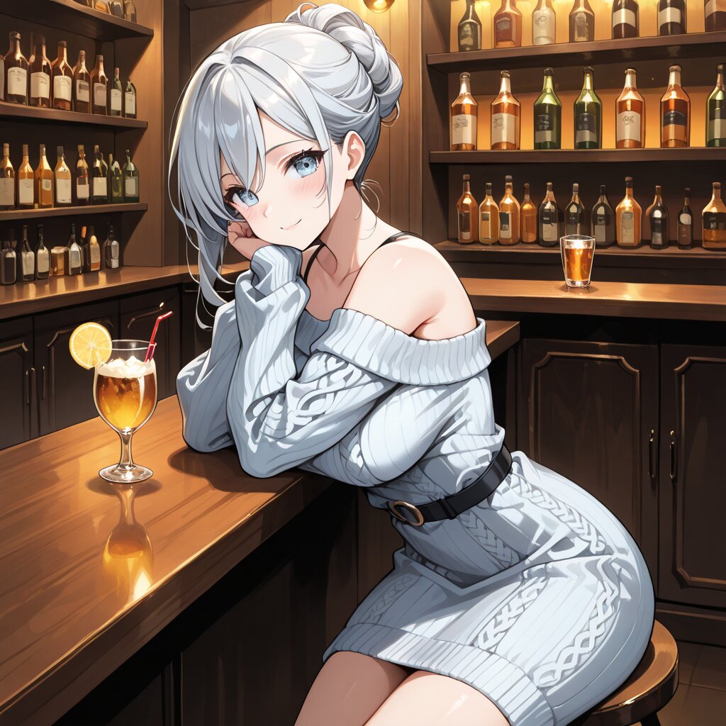 1girl, long silver hair, updo hairstyle, light blue eyes, large breasts, black off-shoulder knit dress, long knit dress, modest dress, sitting at bar counter, alcoholic beverage, cheers, masterpiece, looking at viewer