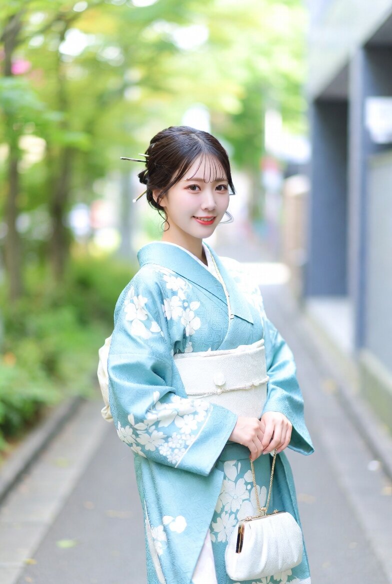A highly detailed portrait of a 日本人26歳 with fair skin, dark hair tied in a traditional updo, wearing a light blue kimono adorned with delicate white floral patterns. She has a gentle smile, standing gracefully on an urban sidewalk with blurred green foliage and buildings in the background. She holds a small white clutch purse with a gold chain in her right hand. Soft natural lighting, realistic photography style, high resolution, elegant and serene atmosphere.プロのカメラマンによる撮影。
