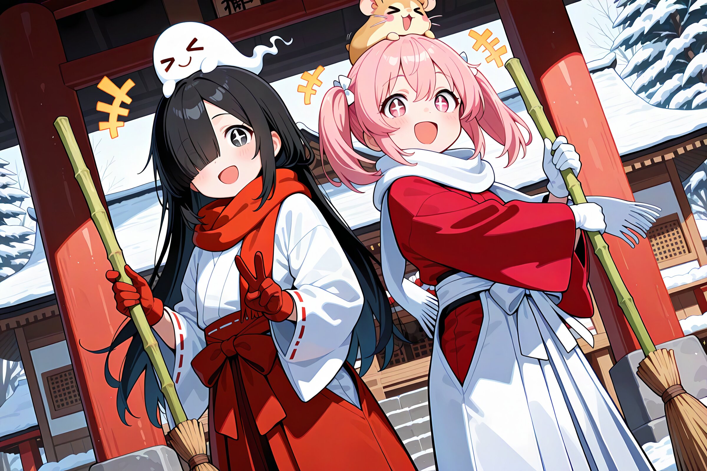 2 little girls, symmetrical pose, diagonal angle, back-to-back, masterpiece, best quality, amazing quality, very aesthetic, black hair, long hair, (ahoge:0.5), (hair over one eye:1.2), black eyes, +_+, open mouth, smile, cheerful, +++, notice lines, choker, miko outfit, white kosode, red hakama pants, red gloves, red scarf, ghost on her head, > <, holding bamboo broom with both hands, v, japanese shrine, winter, outdoors, BREAK 2 little girls, symmetrical pose, diagonal angle, back-to-back, masterpiece, best quality, amazing quality, very aesthetic, pink hair, twintails, pink eyes, +_+, open mouth, smile, cheerful, +++, notice lines, choker, (red kosode:1.2), white hakama pants, white gloves, white scarf, red clothes, hamsters on her head, > <, holding bamboo broom with both hands, japanese shrine, winter, outdoors,