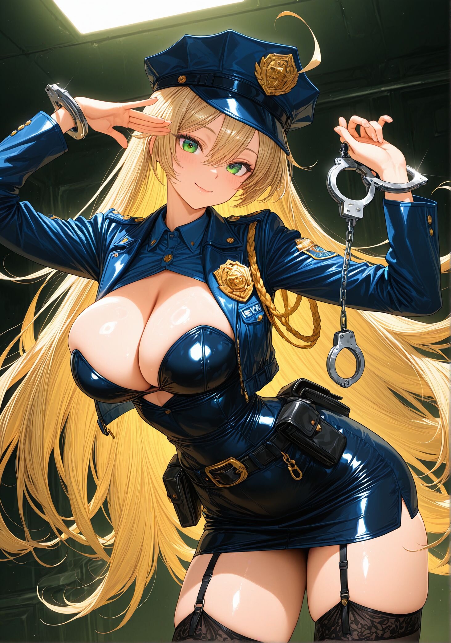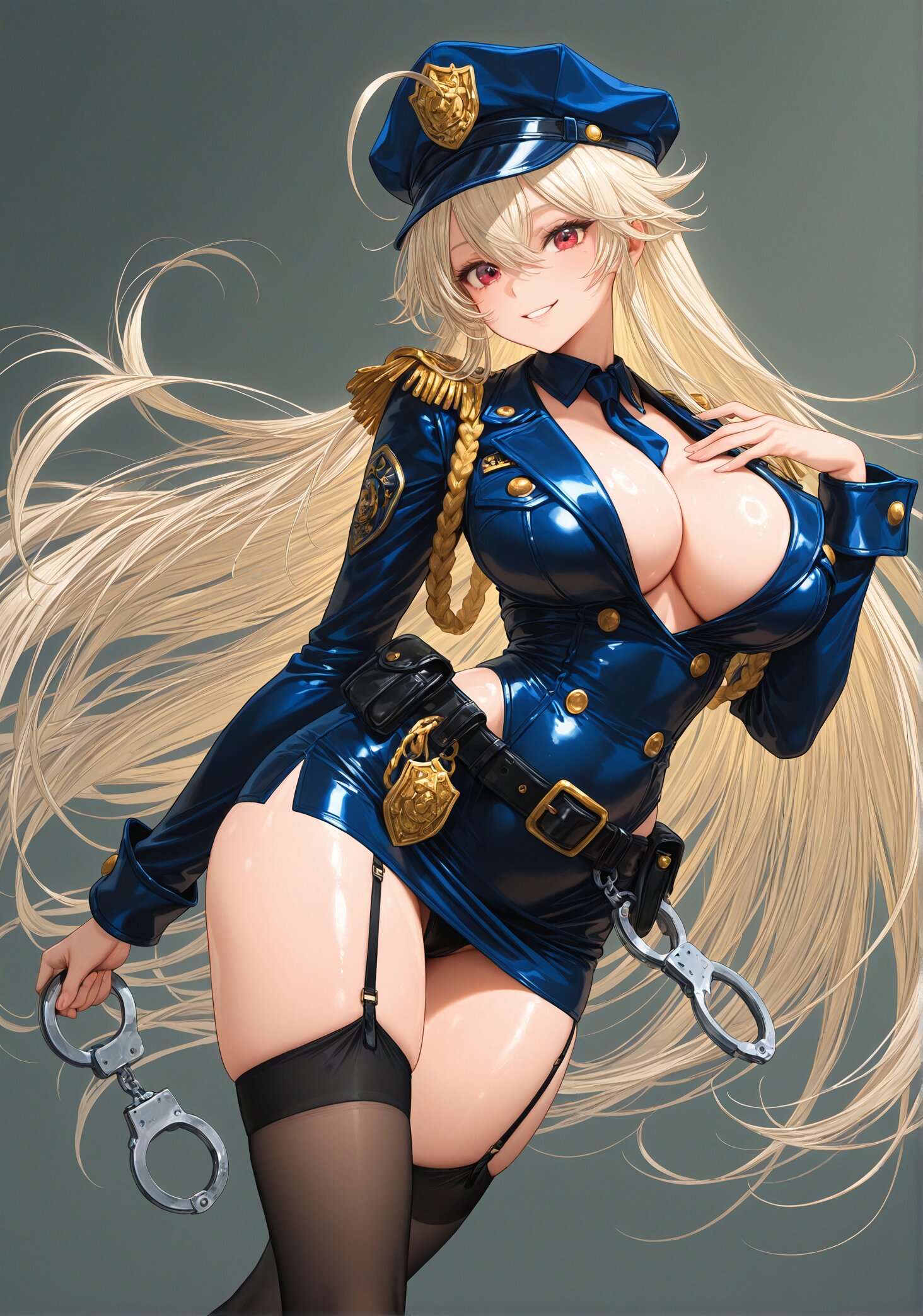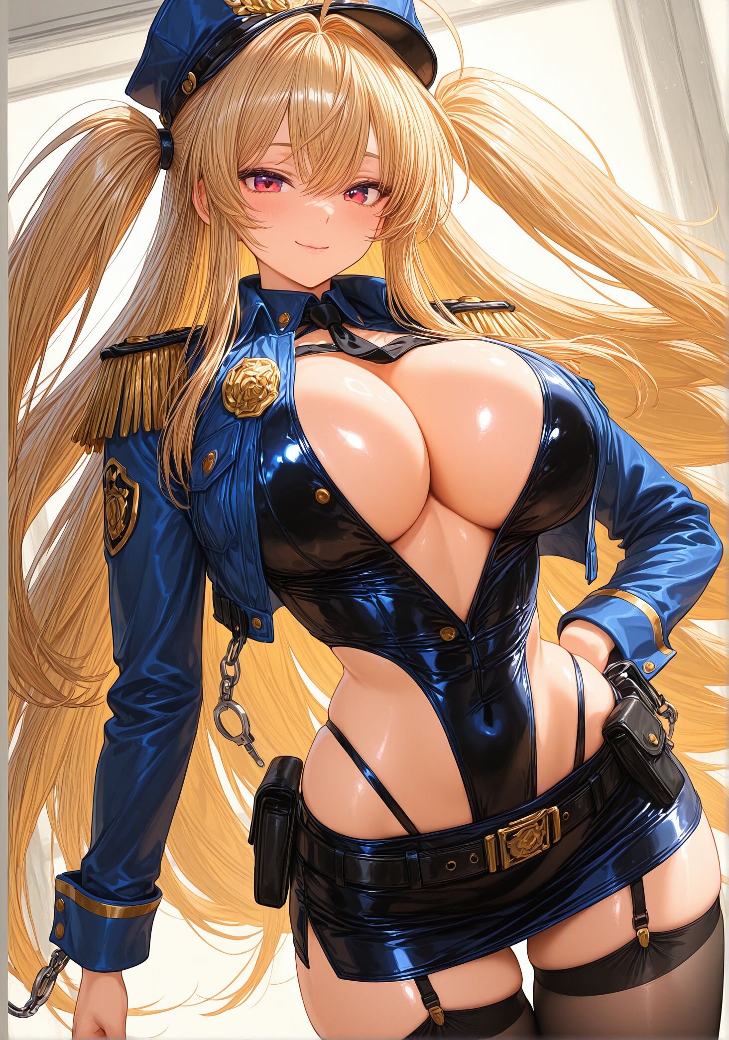(upper body:2.2),(calm smile:1.2),(very long blond hair9,(ahoge:1.5), sexy mini skirt police cosplay,ultra short mini skirt,fitted police jacket, open front,deep cleavage,tight waist, body-hugging outfit,glossy black fabric, gold buttons,police badge,shoulder epaulettes,police cap, tilted,handcuffs on belt,leather utility belt,black garter belt,sheer black stockings, (healthy skin tone:1.4),(glossy skin:1.7), (smooth s:kin1.4),(long legs:1.6),(large breasts and hips), (dynamic sexy pose:1.3),(dynamic sexy angle:1.8), masterpiece, best quality, ultra-detailed, 8k resolution, very aesthetic, <lora:StS-Illustrious-Detail-Slider-v1.0:2.> <lora:sdxl-hairdetailer_02:2>
