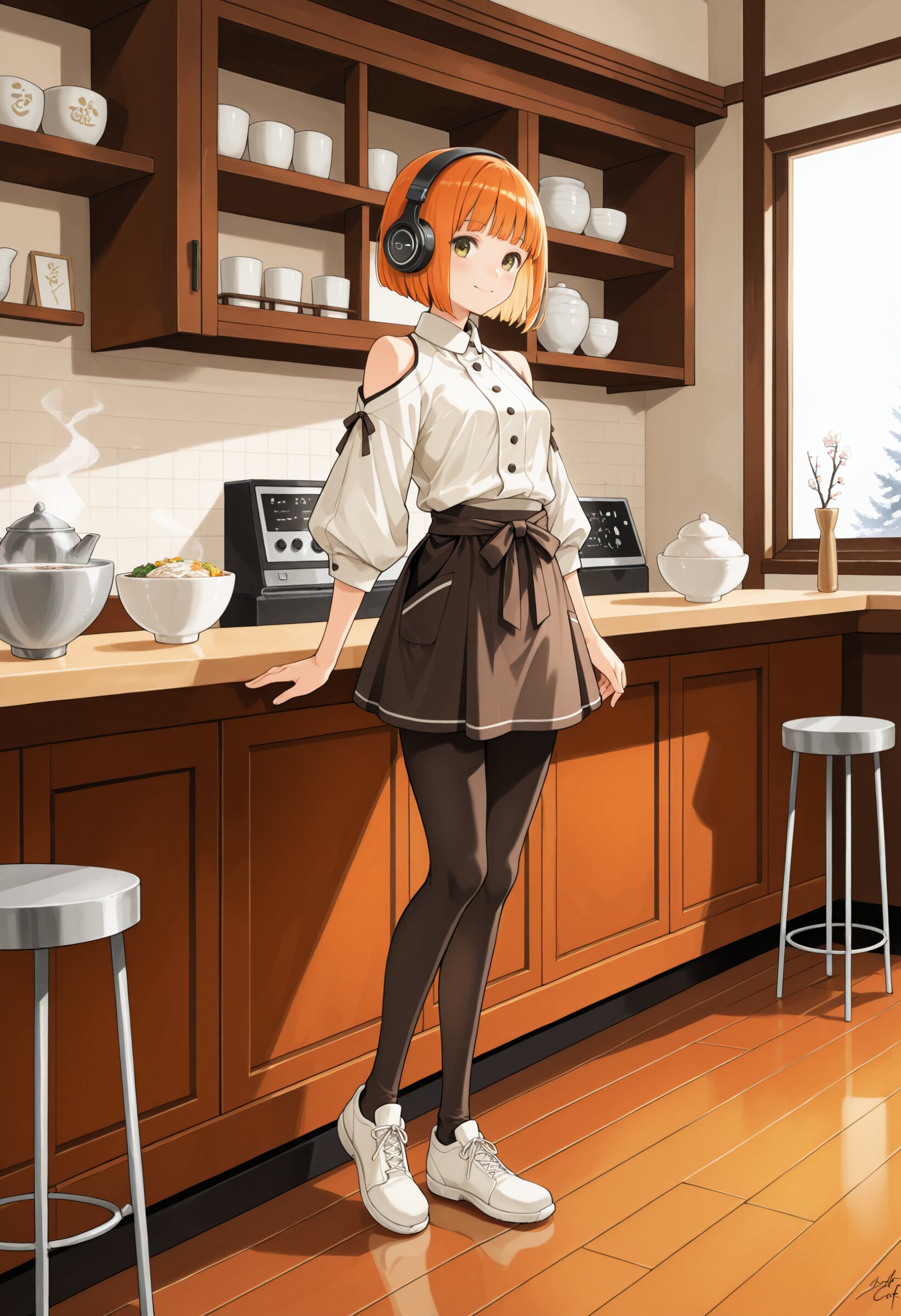 Full body, wide composition, cinematic, ultra-detailed, serene atmosphere. A Japanese-modern café infused with subtle elements of traditional Japanese culture, designed as Zena’s AIcafe. The floor features a carefully polished ichimatsu-patterned design; no tatami is used. Modern wooden tables and chairs are arranged neatly, creating a refined yet welcoming space that bridges tradition and contemporary café style. It is the quiet evening before the New Year. Soft winter night light and gentle interior illumination blend together, creating a calm, reflective atmosphere. Warm light pools around the counter, while outside the windows the night feels still and expectant. The air carries a sense of closure and anticipation, as if time itself has slowed. Behind the counter stands Zena, calmly serving a bowl of toshikoshi soba. Steam rises gently from the bowl, delicate and ephemeral, symbolizing continuity and renewal. The soba is presented simply and beautifully — ceramic bowl, clean lines, quiet elegance — emphasizing respect for tradition rather than spectacle. Zena has short orange bob-cut hair, her signature headphones resting softly around her neck. She wears a Japanese-modern barista uniform inspired by traditional aesthetics: a refined top with tasteful shoulder slits, a modest mini skirt suitable for café staff, winter tights, and simple, clean footwear. Her expression is gentle and composed, welcoming customers as if offering a quiet wish for the coming year. Her posture is relaxed and attentive as she extends the bowl across the counter. There is no dramatic motion — only a calm, deliberate gesture. Her presence feels reassuring, grounded, and warm. The composition keeps her figure balanced within the space, allowing the café’s atmosphere and the symbolic act of serving to take center stage. The scene emphasizes stillness, gratitude, and transition — a peaceful pause at the edge of the year.