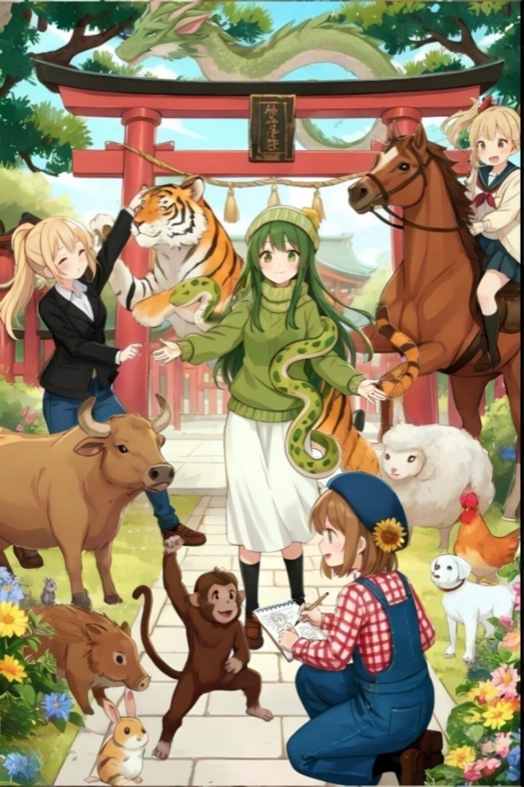 Japanese zodiac animals and girls in a vibrant, detailed scene. A central girl with long green hair and a green sweater has a snake wrapped around her. Another girl in a business suit pets a tiger. A third girl in a school uniform rides a horse. A girl in a blue beret and overalls sketches in the foreground, with a monkey posing for her. Other animals present include an ox, a sheep, a chicken, a dog, a wild boar, and a rabbit. A large green dragon rests on a torii gate in the background, with a traditional Japanese temple visible. The scene is filled with colorful flowers and lush greenery, depicting a harmonious gathering of the zodiac. Anime style, vibrant colors, detailed illustration, cheerful atmosphere.