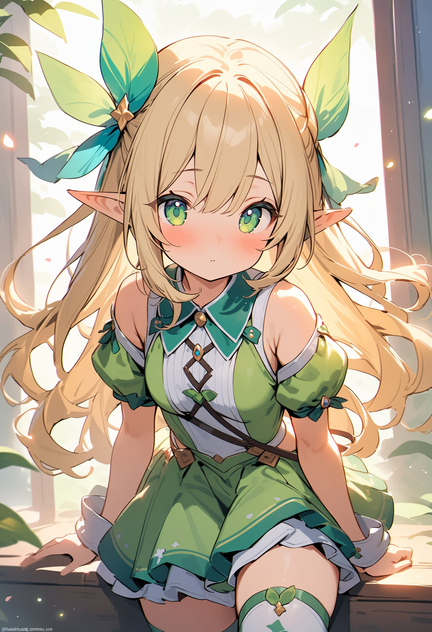 ((masterpiece)), ((best quality)), ((kawaii)), cute, (lovely), ((extremely detailed)), (beautiful), dynamic angle, a cute girl, 1girl, solo, ((elf)),beautiful blond hair, beautiful green eyes, ((beautiful eyes)), long hair, fantasy clothes,