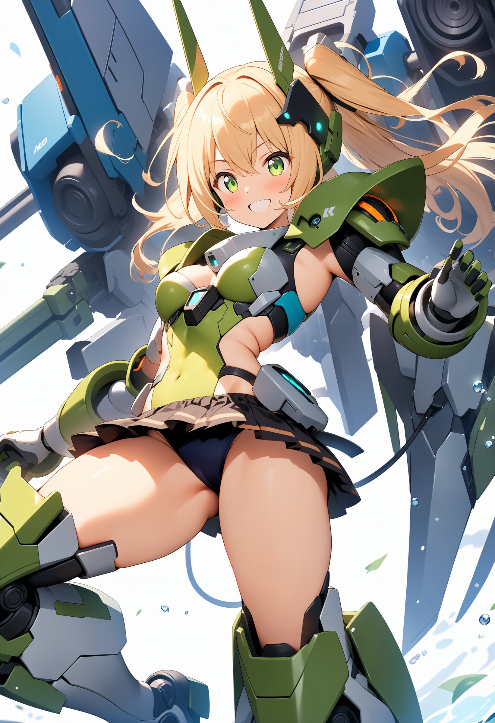1girl, ((white background)), ultra detailed 8k cg render, masterpiece, high resolution, extremely detailed, mecha musume,mecha shoulder, mech leg, headgear, mecha armor, ((mini skirt)),long blonde hair, dropping green eyes, smile, dynamic posing,