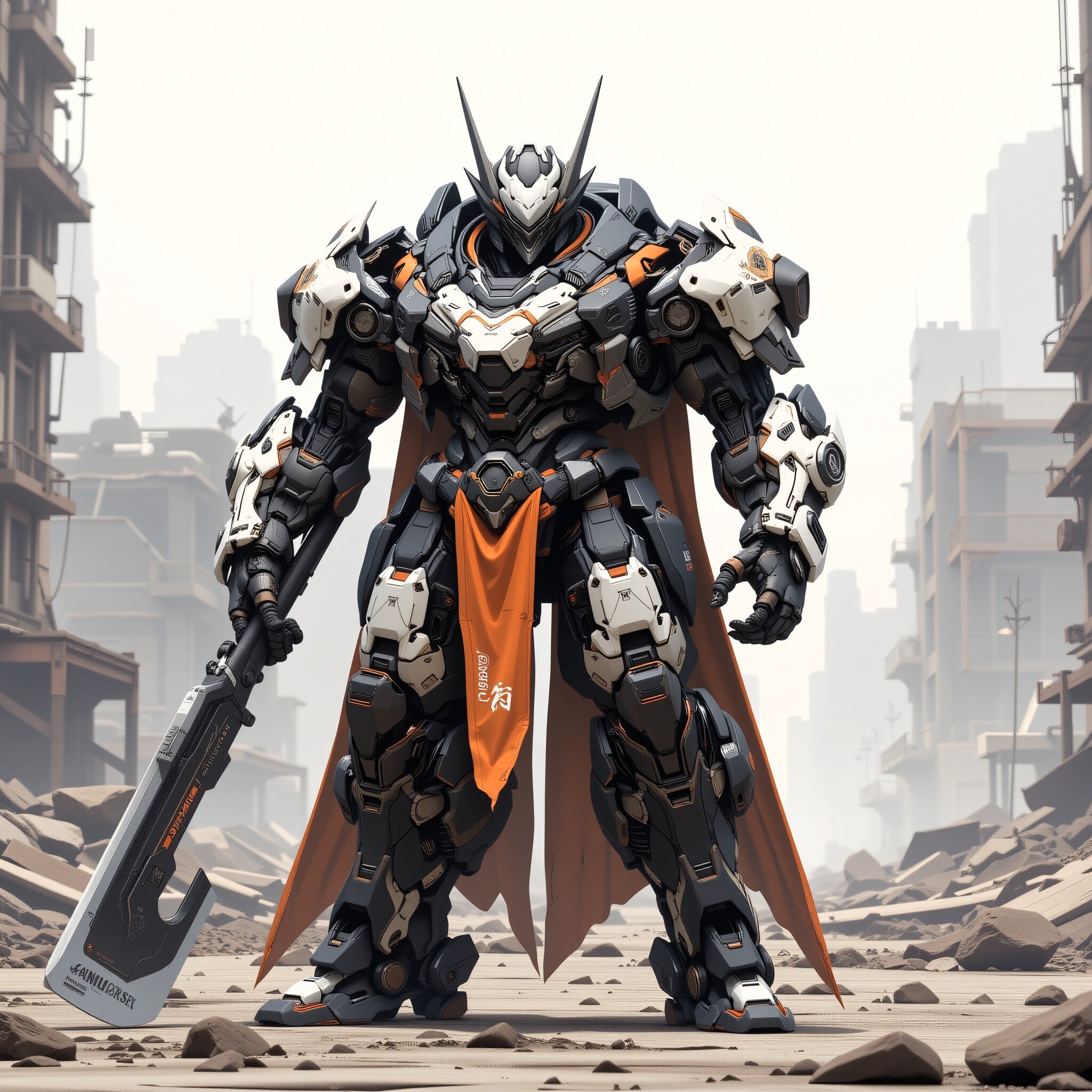 <setvar[color,false]:orange> The rialstic movie still. The contrast between the destroyed cityscape in the background and the mech gives the image a sense of realism and conviction. B_style,This is a futuristic mech warrior. It has a robust, armored body with a color scheme of black, metallic shiny white, and <var:color>. Add detail texture, The well-used mech body had small scratches here and there, and the edges of the armors had worn down and the paint had peeled off, revealing the metal surface. The mech wears a <var:color> cloak and wields a large, mechanical axe. Its design features intricate mechanical details, including exposed components and sharp, angular armor plating. The head has a helmet with a menacing, samurai - like appearance, complete with horn - like protrusions. The overall aesthetic combines elements of cyberpunk and traditional warrior motifs, giving it a powerful and imposing presence. 3D model rendering, white hilight, soft lighting and shadow. Mech is screen center.