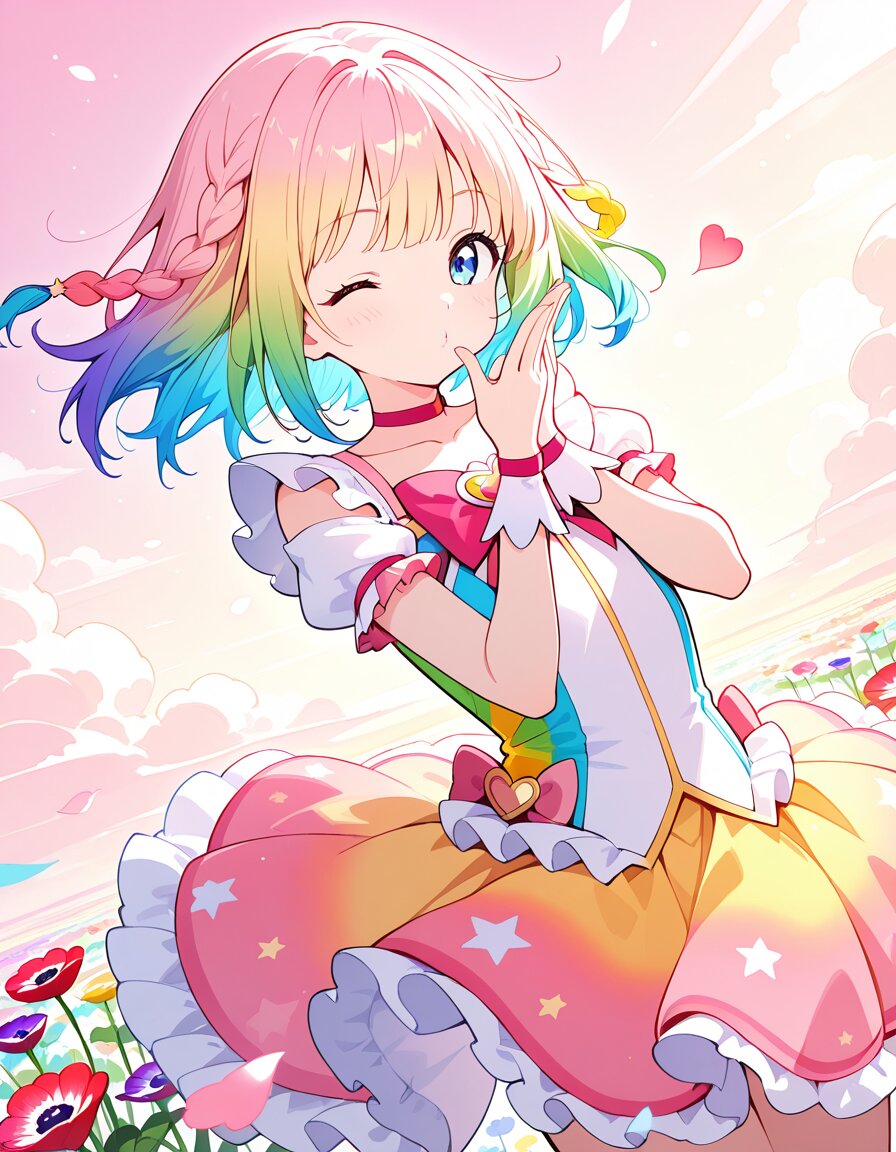 masterpiece, best quality, anime style, highly detailed, kawaii, petite, flat chest, bright but calm atmosphere, magical girl, short bob, side braids, rainbow-colored hair, smooth gradient, floating hair, floating clothes, floating skirt, frilly outfit, rainbow-themed, ribbons, heart motifs, star motifs, confident smile, subtle playful expression, kiss face, gently puckered lips, wink, one eye closed, open eye calm and clear, cowboy shot, dynamic angle, RIGHT hand making a sideways peace sign, horizontal V sign, peace sign held near shoulder, palm facing outward, LEFT hand in front of mouth, hand touching lips, blowing a kiss, air kiss gesture, soft heart-shaped light from lips, few glowing hearts, light kiss trail, light blush, floating flowers, rainbow-colored anemone flowers, soft light particles, ethereal sky, soft clouds, sunlight, pastel color tones, cinematic lighting, rainbow hues