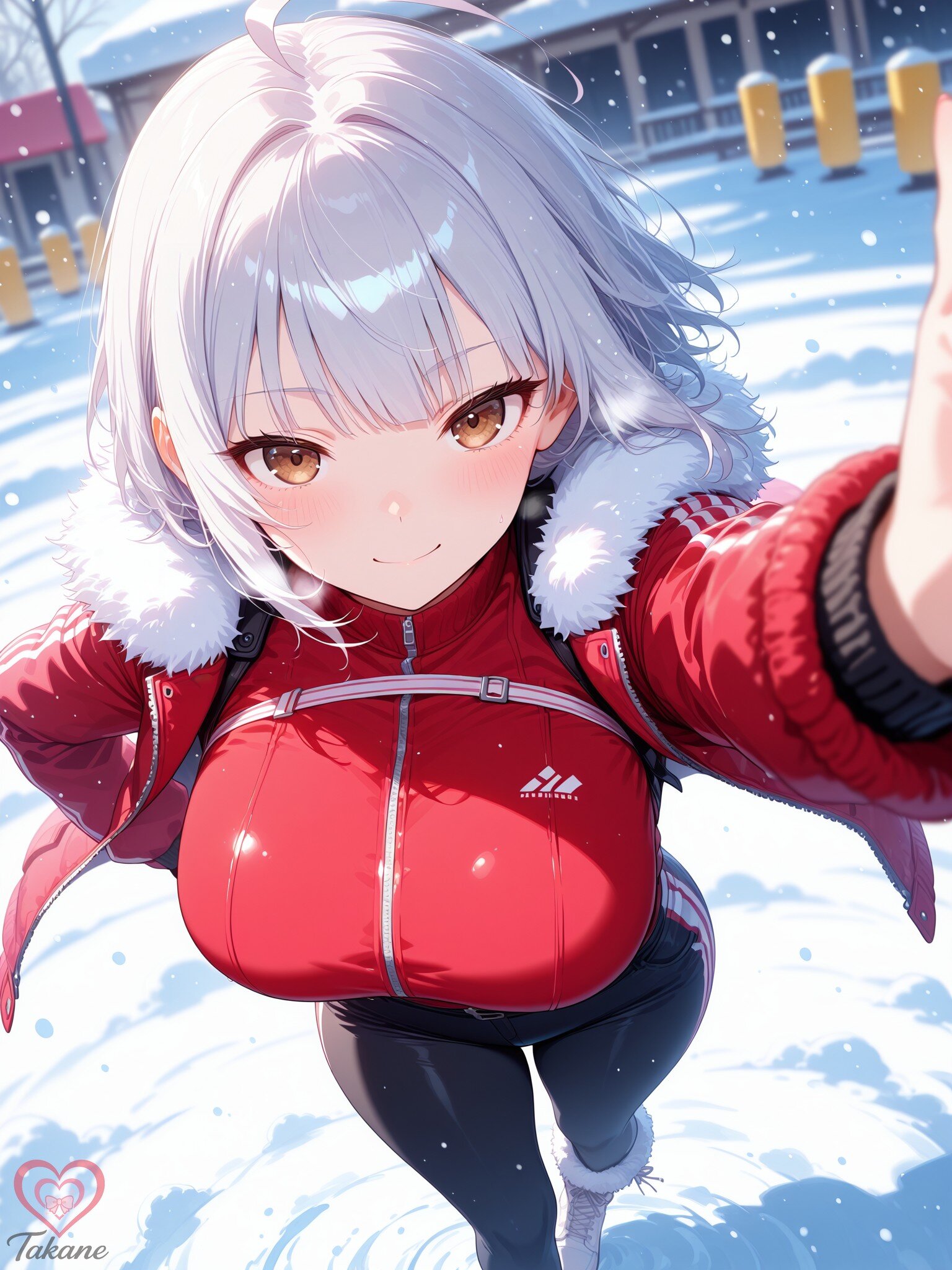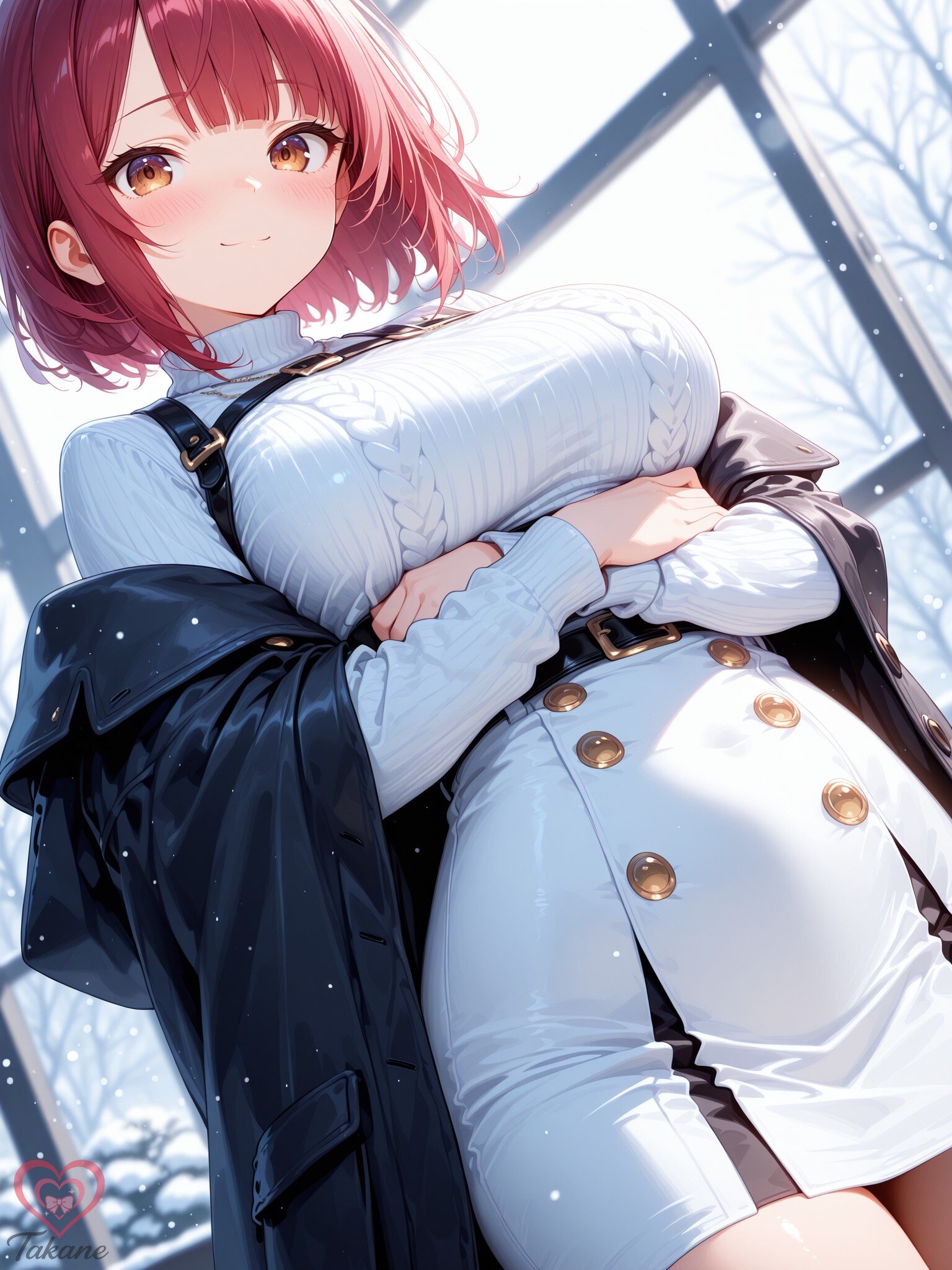 a shy smile, blushing heavily, flushed cheeks,long black duffle coat with toggle buttons, thick white cable knit sweater, plaid thermal mini skirt, stepping down firmly, strong confident pose,