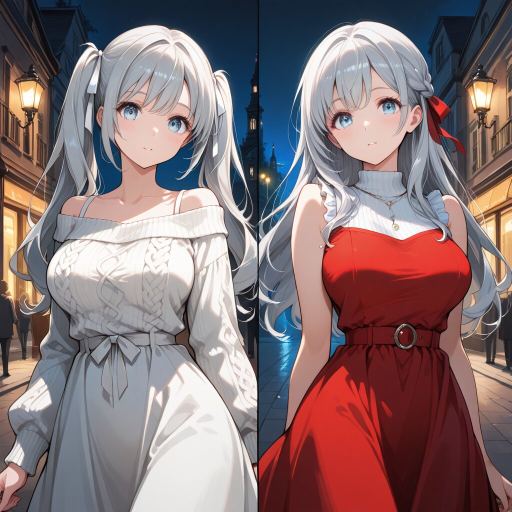 1girl, same character, split-screen composition, left-right split, high contrast composition, silver hair, long hair, twintails, translucent light blue eyes, large breasts, high quality, ultra-detailed, delicate line art, soft lighting, left side, outdoor background, night streets, cool and quiet atmosphere, white one-shoulder long knit dress, modest exposure, elegant and calm impression, thick knit material, careful knitting, natural fabric wrinkles, hair with red ribbon, simple accessories, right side, indoor background, warm lighting, elegant and calm interior, frilly red dress, modest exposure, classical and cute design, overlapping frills, lace decoration, soft fabric texture, hair with white ribbon, delicate accessories, elegant pose, identical facial features, body shape and hairstyle on both sides, cinematic lighting, deep expression, professional finish, no text, no watermark