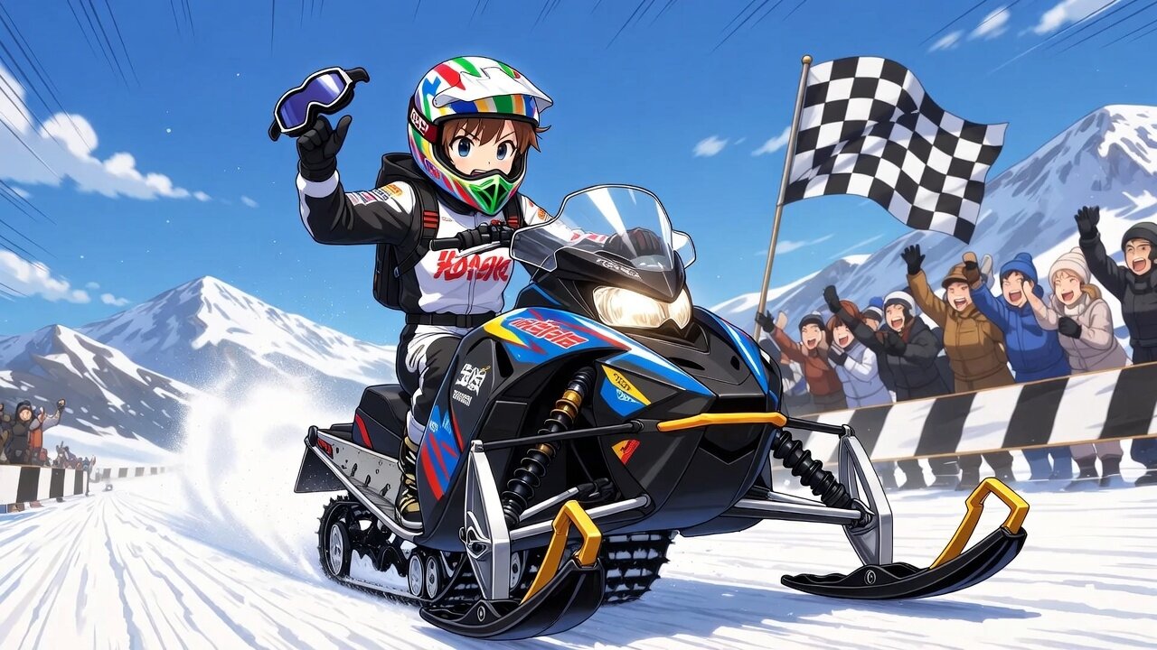 A thrilling illustration of a snowmobile racer crossing the finish line in a winter sports competition. The racer, a determined athlete in a colorful helmet and racing suit, raises both arms in victory while speeding on a powerful snowmobile, holding a コーグル and showing a smile. Snow sprays dramatically from the tracks, with a checkered flag waving and cheering crowds in the snowy background. Majestic snow-covered mountains under a clear blue sky, high-energy action scene, detailed machinery, vibrant winter colors, in the style of Japanese shonen manga.