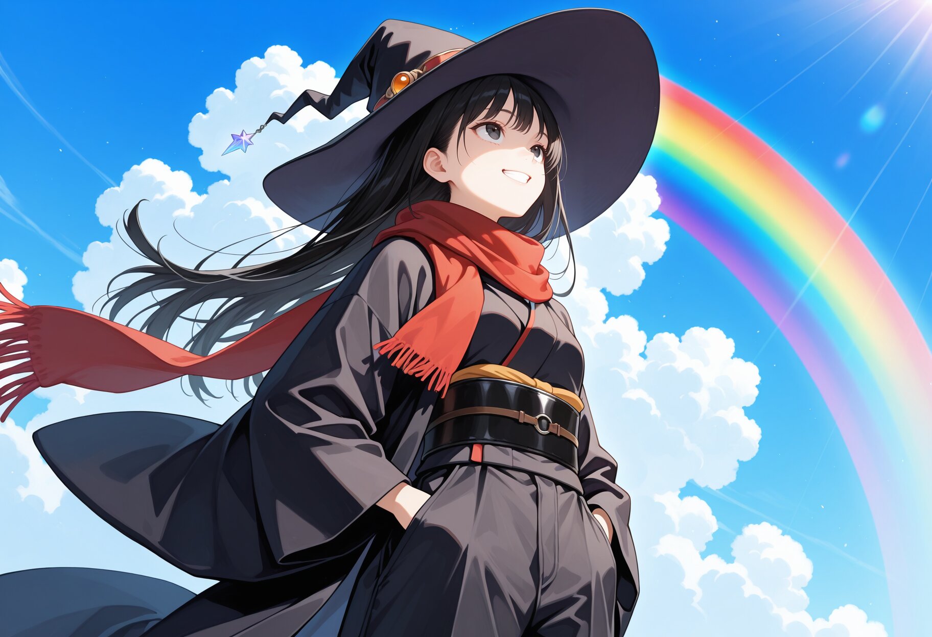 masterpiece,best quality,highres,highly detailed,general,(large rainbow,looking up,looking to rainbow:1.2),1girl,solo,17yo,(hands in pockets, black witch hat,long red scarf,grin),cute girl,slender,small breasts,long sleeves,light smile,black hair,long hair,bangs,black eyes,Witch girl,(long black Witch cloak,long black Witch kimono robe, black obi,long black cargo pants),boots,slender girl,upper body,fantasy, blue sky garden,soft sunlight,from below,
