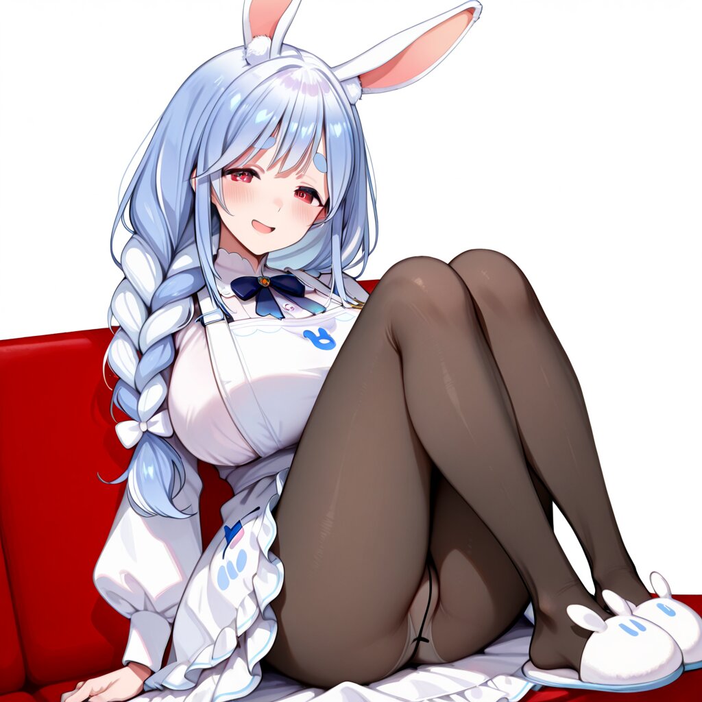 <lora:pekora mammy:1>1girl, solo, long hair, looking at viewer, very kind smile, sad eyebrow, open mouth, bangs, very blush, red eyes, dress, bow, animal ears, blue hair, full body, braid, white hair, pantyhose, multicolored hair, white dress, rabbit ears, apron, animal ear fluff, black pantyhose, white footwear, thick eyebrows, mature female, short eyebrows, rabbit girl, slippers, hair, huge breasts, slender, mama, pekora mammy, living room, random pose, random angle,