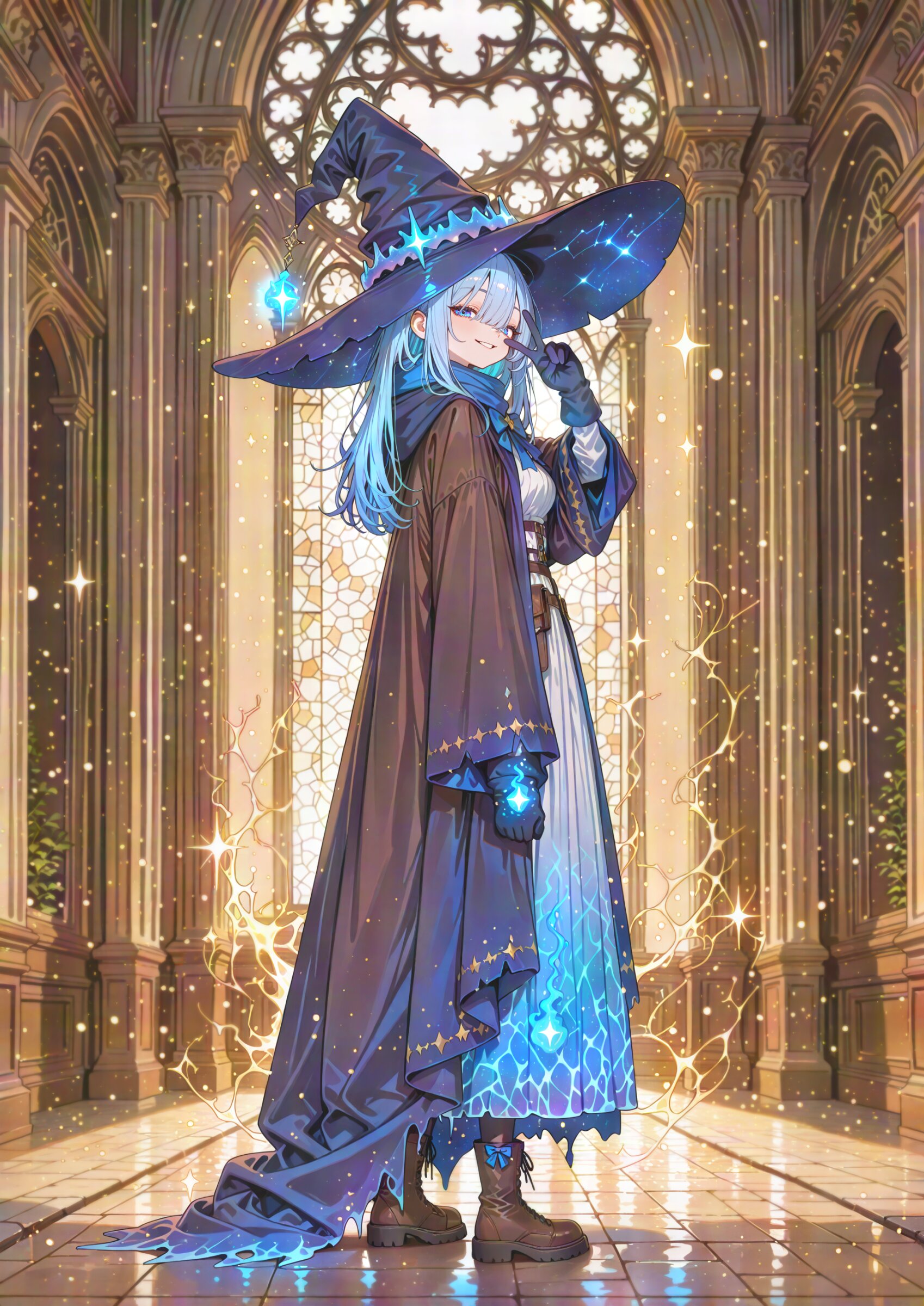 Over the Shoulder Shot, looking back, (very wide shot:1.2), vanishing point looking at viewer, 1girl, witch girl, blue eyes, beautiful iridescence eyes, beautiful detailed eyes, beautiful light blue hair, long bangs, long disheveled beautiful hair, first-rate female bodies, perfect body, beautiful breasts, framed breasts, cool face, (Beautiful Lips:0.7),, long hair, (stylish beautiful witch dress:1.2), white elbow gloves, (cute dark blue and white witch girl costume:0.9), (white blouse:1.3), bow tie, witch long skirt (overskirt:1.1) blue cloak, (blue galaxy witch hat:1.1), lace-up boots on feet, stockings and suspenders, under black over coat, blue scarf, winter glove, mysterious face, significant smile,evil smile cast a magic, ice magic, teach the ways of magic, teacher, caustics, brown theme, winter atmosphere, v over eye, masterpiece, best quality, amazing quality, very aesthetic, absurdres, newest, you can add scenery, (volumetric lighting), To make the background more distinctive. professional art lots of details, , overexposure, shiny-glistening, (watercolor style:0.5), (pastel color style:0.5) 4ur4_illu,shiny, glowing, glowing particles, glowing light particles, light particles, <lora:noline (1):1.0> <lora:sdxl2-flat2-512b:-0.2> <lora:facelightup_xl_v10:0.5> <lora:V2_yakumo_alchemy:0.5> <lora:Aura_illu:0.1>