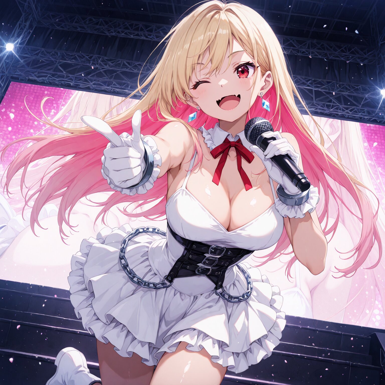 (1girl), young female, BREAK, Blonde, (long hair:1.2), (Straight Hair:1.3), (sharp bangs:1.3), long bangs, Long sideburns, (pink inner hair:1.2), (gradient hair from blond to pink:1.3) BREAK, red eyes, slanted eyes, Highlights, beautiful eyes, beautiful pupils BREAK, slender, shiny body, shiny skin, (full breasts:1.3), Tight, tight waist, toned body, narrow waist, athletic body, (muscular abs, abs:0.8), muscular BREAK, ((diamond-shaped earrings)), chain belts, chains, chain accessories, Chain bracelet, ring, , ((skin fangs)) Bare shoulders, cleavage, neck ribbon, red ribbon, white dress, (idol costume) ruffle skirt, white gloves, white boots, holding a microphone, one eye closed, smiling, mouth open, index finger raised BREAK, (newest, anime, animation, anime screen capture, anime style:1.3) BREAK, (masterpiece, , vibrant, very aesthetic, highly detailed, best quality, 16k:1.3) perfect fingers,