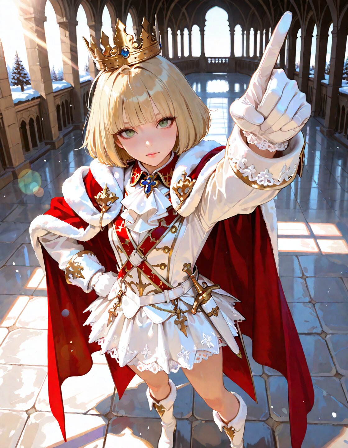 solo,1boy,ahoge,green eyes,blonde hair,short hair, straight hair, blunt bangs,hime cut,delicate hair,detailed hair, delicate face,detailed face,detailed skin,masterpiece,best quality,insanely detailed,beautiful, 16k,photorealistic,looking at viewer,pointing up,one hand on hip,(White luxurious Prince costume:1.5),(Red luxurious Cape:1.3),(luxurious crown:1.5),(white luxurious gloves),(white luxurious mini skirt),(white luxurious long boots),(dagger on waist),prince charming,medieval europe,in the afternoon,cute,fantasy,dreamy atmosphere,classic academia,lens flare,winter,sunlight,sunbeam,soft lighting,in focus with blurred background,long sleeves,white lace jabot,full body,from above