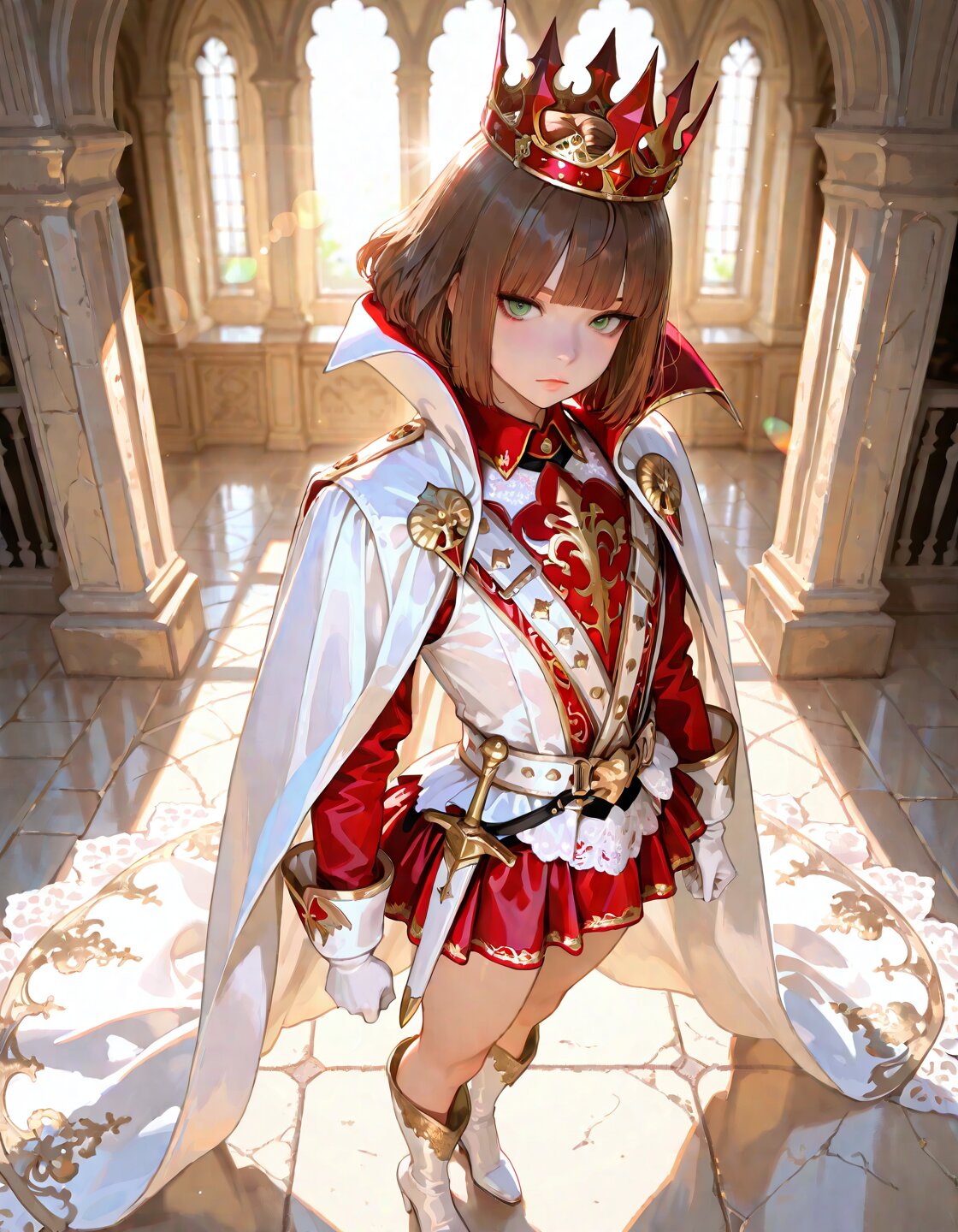 solo,1boy,ahoge,green eyes,brown hair,short hair, straight hair, blunt bangs,hime cut,delicate hair,detailed hair, delicate face,detailed face,detailed skin,masterpiece,best quality,insanely detailed,beautiful, 16k,photorealistic,prince charming,cute,looking at viewer,expressionless,(luxurious Red Prince costume:1.6),long sleeves,white lace jabot,(luxurious White Cape:1.3),(luxurious crown:1.5),(white luxurious gloves),(Red luxurious mini skirt:1.4),(white luxurious long boots),(dagger on waist),medieval europe,in the afternoon,fantasy,dreamy atmosphere,classic academia,full body,from above,in the luxurious Palace,Rococo Architecture,lens flare,sunlight,sunbeam,soft lighting,in focus with blurred background