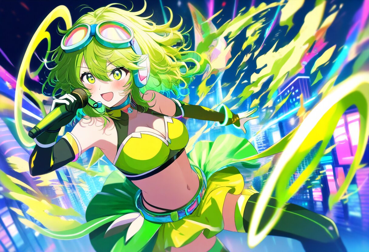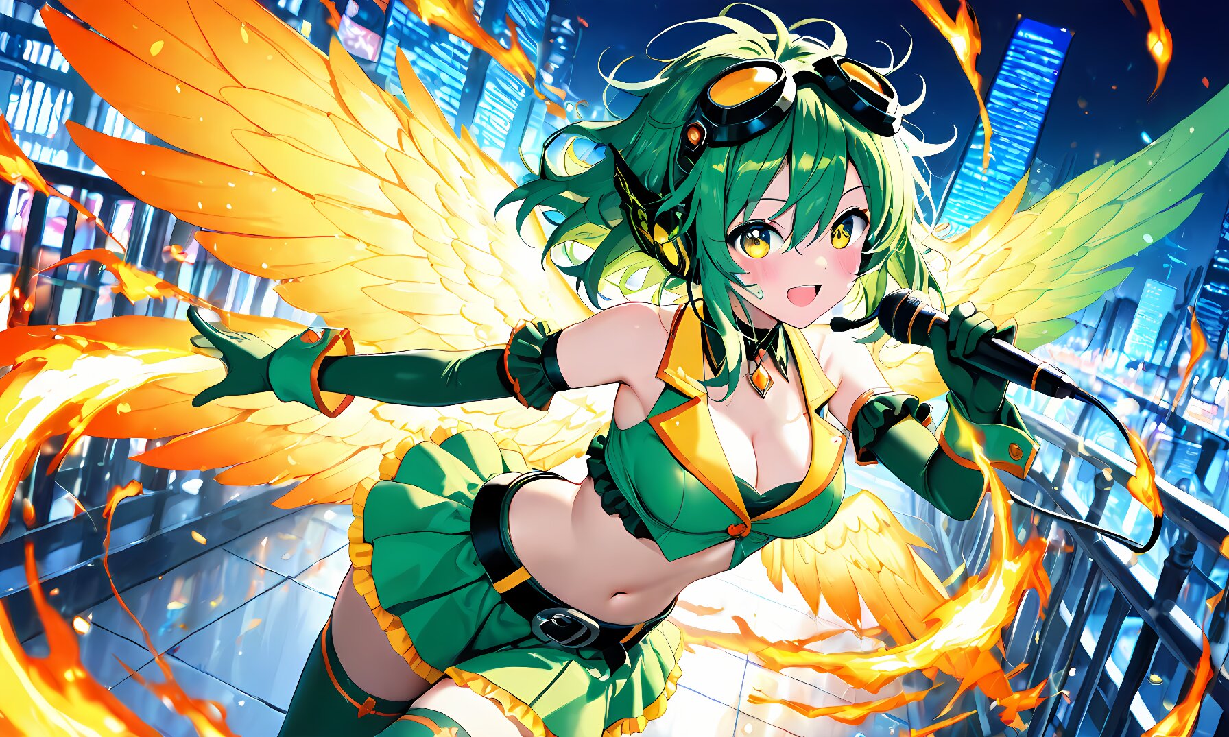 best quality,absurdres,8k,ultra detailed,very aesthetic,1girl,(rating: general:1.2), energetic anime girl with olive-green hair, fiery magical rings, vibrant city nightscape, dynamic pose, colorful futuristic outfit, glowing effects. The image shows an animated girl with green hair and a yellow top holding a black microphone. (messy hair:1.5), medium hair, olive-green hair, large expressive yellow-green eyes, flushed cheeks, open mouth, medium breasts, hair between eyes, (beautiful eyes), sidelocks, 1girl, solo, breasts, smile, blush, skirt, gloves, navel, thighhighs, cleavage, bare shoulders, :d, frills, wings, choker, belt, elbow gloves, midriff, crop top, wrist cuffs, see-through clothes, zettai ryouiki, goggles, microphone, headset, goggles on head,