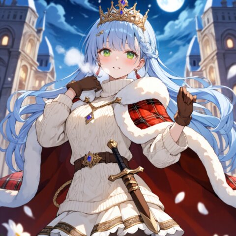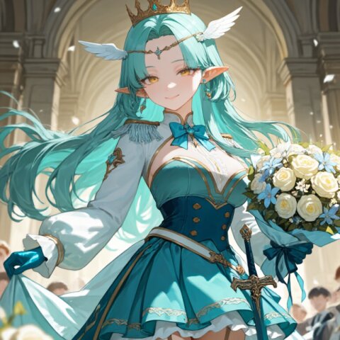 A young 13-year-old girl with a delicate, cute face and expressive blue eyes sits gracefully on a luxurious chair in a palace setting. She has very long blonde hair styled in a french braid with a (hime cut:1.1) and blunt bangs, meticulously detailed. She wears a (Pale Blue luxurious prince costume:1.4) with long sleeves, a dark blue lace jabot, and a (Beige luxurious cape:1.2) draped elegantly over her shoulders. A (Dark Blue luxurious mini skirt:1.4) complements her outfit, along with beige luxurious boots. A (dagger on waist:1.3) and a (luxurious crown on head:1.2) complete her regal attire. Her posture is refined—legs closed, holding a delicate tea cup with a calm smile. The background features grand organic architecture bathed in soft afternoon sunlight, with lens flares and a subtle bloom effect enhancing the romantic and chill atmosphere. The style is an intricate, highly detailed illustration with outstanding intricacy and anti-aliasing, evoking a blissful and cinematic mood.