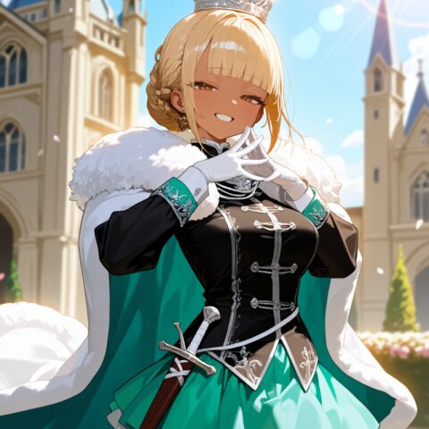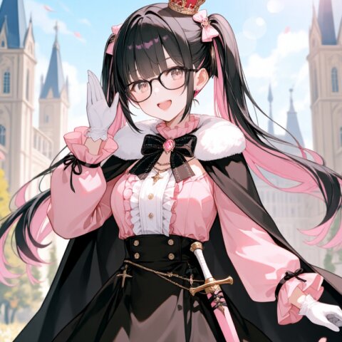 A stunningly beautiful young woman with very long, straight white hair and light gray eyes stands expressionless in a romantic gothic palace setting at night. Her delicate face features a mole under one eye, pale flawless skin with heavy yet elegant makeup, and luxurious glasses that enhance her piercing gaze. She wears an exquisitely detailed (luxurious Black Prince costume with Blue trim:1.6) featuring long sleeves, (luxurious Black mini skirt:1.4), and (luxurious Blue Boots:1.3). A (luxurious Blue Cape:1.3) flows dramatically behind her, while (luxurious White Gloves) cover her slender hands. A (dagger on waist:1.3) and (luxurious crown on head:1.4) complete her royal ensemble. The background showcases intricate Gothic architecture with towering stone pillars, arched windows, and carved details, surrounded by blooming flowers under a starry night sky. Soft lighting creates an ethereal glow, highlighting the incredible detail in her costume, hair, and surroundings. The image captures a perfect balance between dark romanticism and aristocratic elegance with absurdly detailed textures in every element.