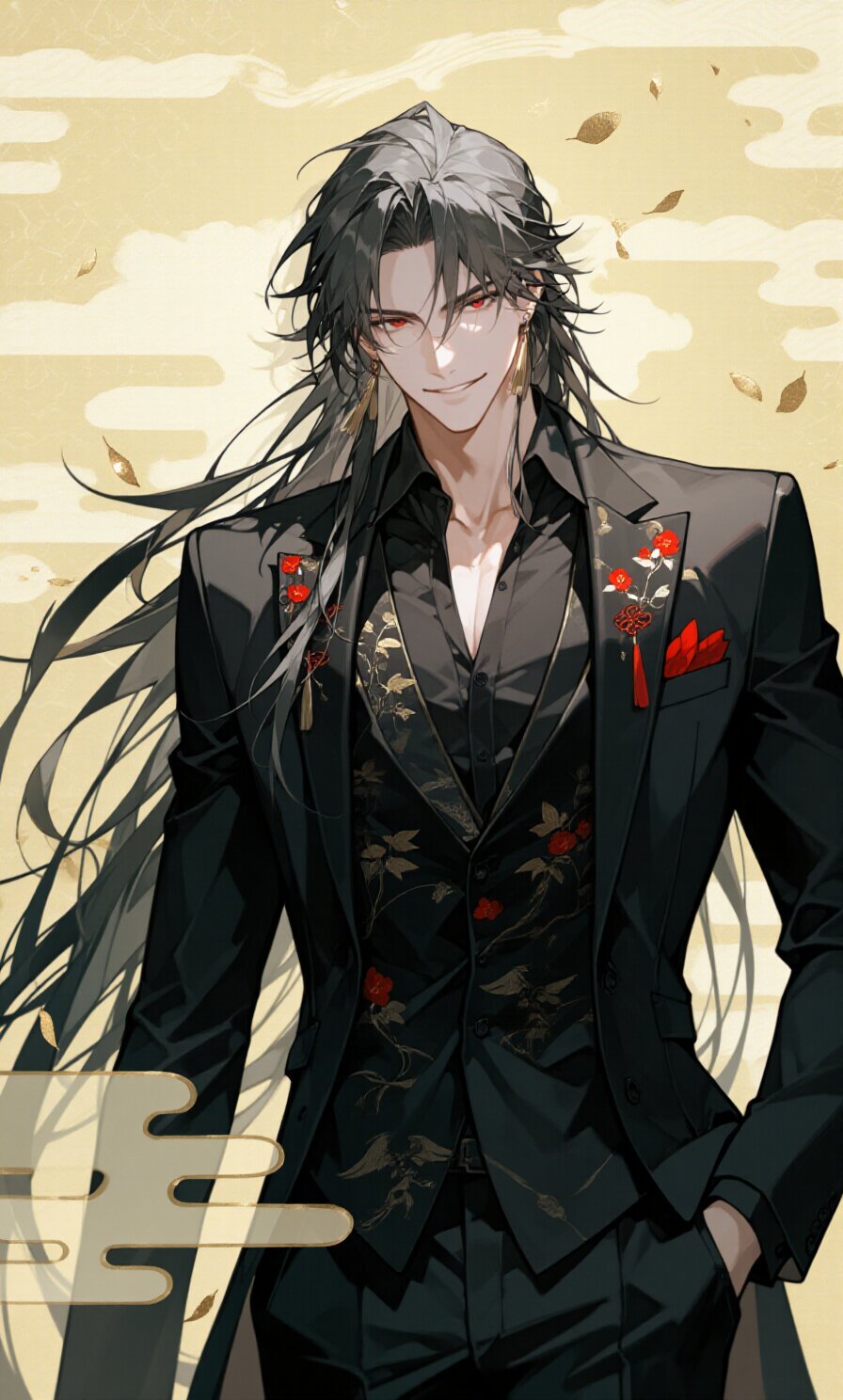 (masterpiece, best quality, highres, 8k illustration), anime-realistic illustration, ultra-detail, polished shading, perfect symmetry, cinematic soft light, elegant aesthetic, refined beauty, A dangerously alluring and mature Chinese man, 36 years old. He wears his long, layered, grayish-black hair swept back, his sharp red eyes gleaming with a confident smile black suit jacket decorated with intricate red flower embroidery, especially around edges, sleeves and collars. His vest, partially visible below, features detailed traditional patterns of birds, fish, and ivy embroidered with red and gold threads. he wears an open-collar black silk dress shirt. His muscular physique peeks through the slightly open collar. Luxurious and atmospheric. Anime-style, high-definition. ultra-detailed fabric, fine embroidery, realistic folds background: luxurious Japanese-style abstract background, soft golden and pale yellow color palette, traditional Japanese patterns inspired by shippo (interlocking circles), layered washi paper texture, subtle cloud-like flowing shapes, delicate gold leaf flakes scattered gently, soft gradation and airy translucence, refined festive atmosphere, elegant and calm, soft shadow beneath the feet, clean line art, high-definition lighting, harmonious color balance