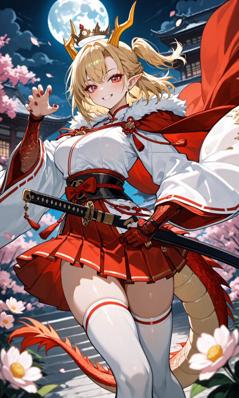 A stunning 18-year-old dragon girl stands confidently in a dynamic pose, her (blonde hair:1.2) styled in a medium-length half-updo with a (side ponytail:1.3) cascading down her shoulder. Her striking red eyes shimmer with iridescence, accentuated by bold (eyeshadow:1.2). Two gleaming (gold dragon horns:1.2) curve gracefully from her head, complementing her fierce yet elegant presence. She wears a (White luxurious Prince costume with red trim:1.6), featuring long sleeves, a (luxurious red cape:1.3) billowing behind her, and a (luxurious red mini skirt:1.4) paired with (White luxurious thighhighs:1.3). A (katana on waist:1.3) hints at her warrior spirit, while a (luxurious crown on head:1.4) crowns her with regal authority. Her toned physique (muscle, buff, ultra-detailed muscle:0.4) exudes strength, with a first-rate feminine frame—perfectly proportioned breasts, smart hips, and an average height. Her red dragon tail sways subtly, adding to her mythical allure. Delicate red nail polish adorns her fingers, and her skin, face, and hair are rendered in exquisite detail, capturing every strand and pore. The scene unfolds outside a grand palace with traditional Japanese architecture, surrounded by blooming Japanese flowers under a moonlit sky. The romantic academia atmosphere blends with the night’s darkness and gloom, illuminated by soft moonlight. Her expression is a mix of happiness and cheerfulness, grinning with a cute yet commanding aura, embodying both charm and power. Masterfully detailed, this 16K masterpiece radiates beauty and fantasy.