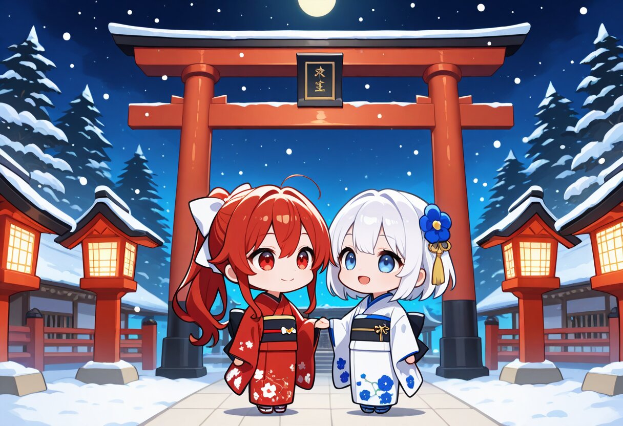 chibi,2girls,red tair,red eyes,smile,long red kimono,flower patterned kimono,obi,winter,night,torii,shrine,fantasy BREAK chibi,2girls,white hair,smile,long white kimono,flower patterned kimono,obi,winter,night,torii,shrine,fantasy BREAK masterpiece,best quality,highres,highly detailed,ultra detailed eyes,general,chibi,night,torii,shrine,fantasy,