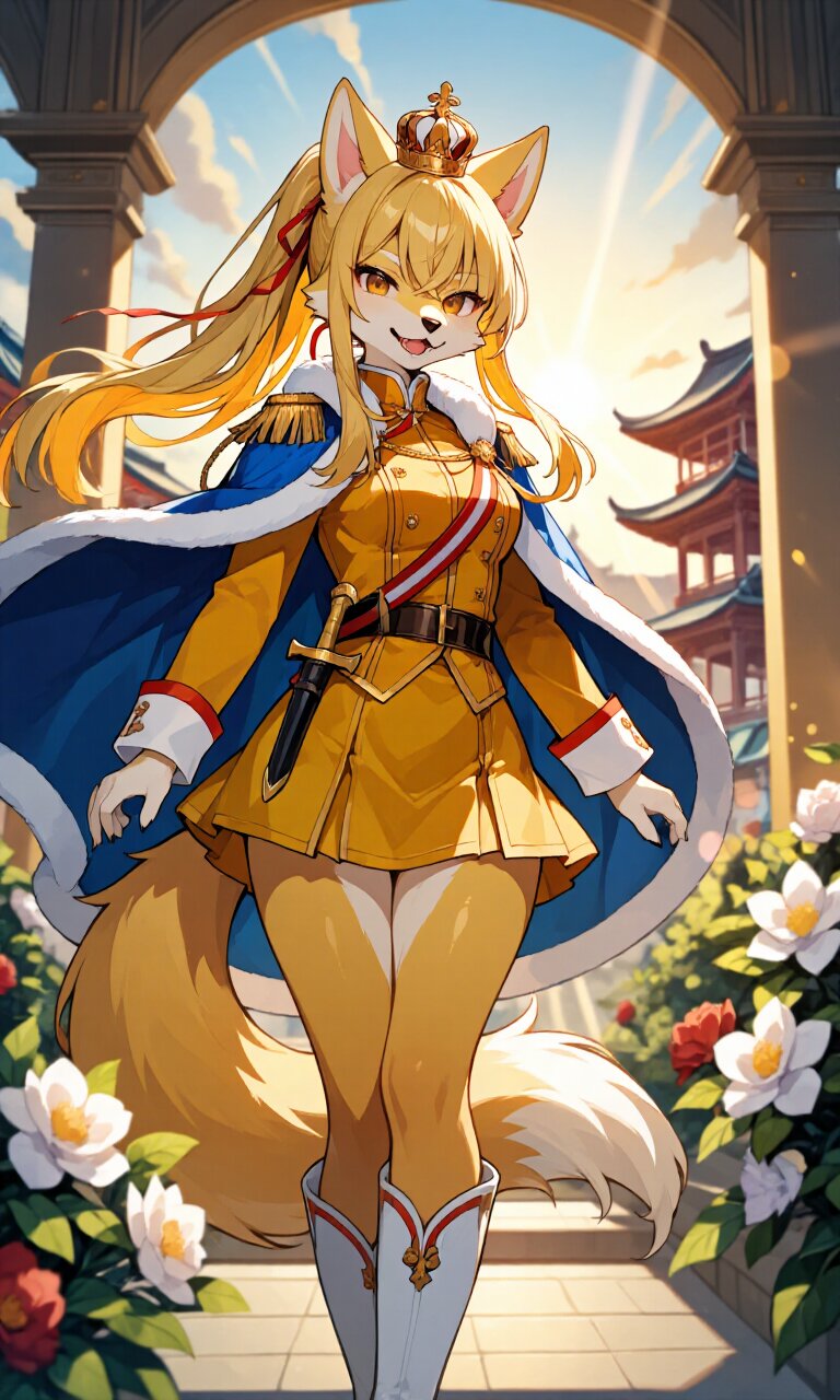 A stunning (wolf girl) with a distinctly (snout:1.3) and golden fur stands confidently in a luxurious palace courtyard adorned with Taiwanese architecture and flowers. She has wolf ears perked up attentively and a long, fluffy tail swaying gently. Her golden eyes, tsurime-shaped with a slight emptiness, gaze forward with an air of regal charm. Her blonde hair cascades in a (long high ponytail:1.2) with hime-cut bangs and (long sidelocks:1.2), featuring colored inner strands that shimmer under the morning sun. Her delicate face, framed by (crossed bangs:1.1), exudes happiness with a bright, cheerful smile. She wears a breathtaking (goldenrod luxurious Prince costume with red trim:1.6) with long sleeves, paired with a (luxurious goldenrod mini skirt:1.4) and (White luxurious Boots:1.3). Draped over her shoulders is a majestic (luxurious Blue Cape:1.3), and atop her head rests an ornate (luxurious crown on head:1.4). A finely crafted (dagger on waist:1.3) completes her princely attire. The setting is bathed in the warm glow of sunrise, with sunlight filtering through the palace arches, casting soft beams and lens flares across the scene. Lush Taiwanese flowers bloom around her, enhancing the romantic, academic atmosphere. Her pose is both cute and dignified, embodying the essence of a fairy-tale Prince Charming. The artwork is insanely detailed, with masterful rendering of fur, fabric, and architectural elements.