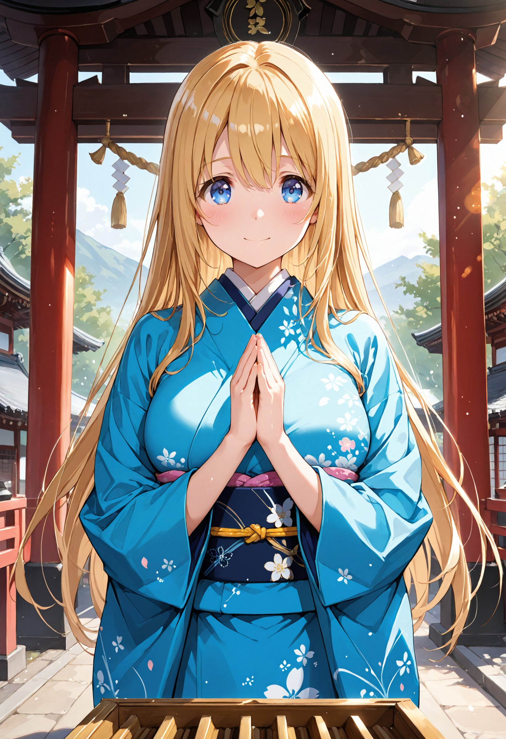 (masterpiece,high resolusion,illustration,ultra detailed 8k art,extremely detailed CG,official art,clothes reflecting light,detailed shiny skin,detailed background:1.3), ((highly detailed beautiful face and eyes)) BREAK 1girl, solo, standing, face_focus, 16-year-old, kawaii, cute_face, tareme, inocent_smile, no_makeup, beautiful_anime_girl, blonde_hair, long_hair, straight_hair, blue_eyes, beautiful_eyes, large_breasts, beautiful_breasts, praying, furisode, furisode_sleeves BREAK shrine, donation_box, outdoor,