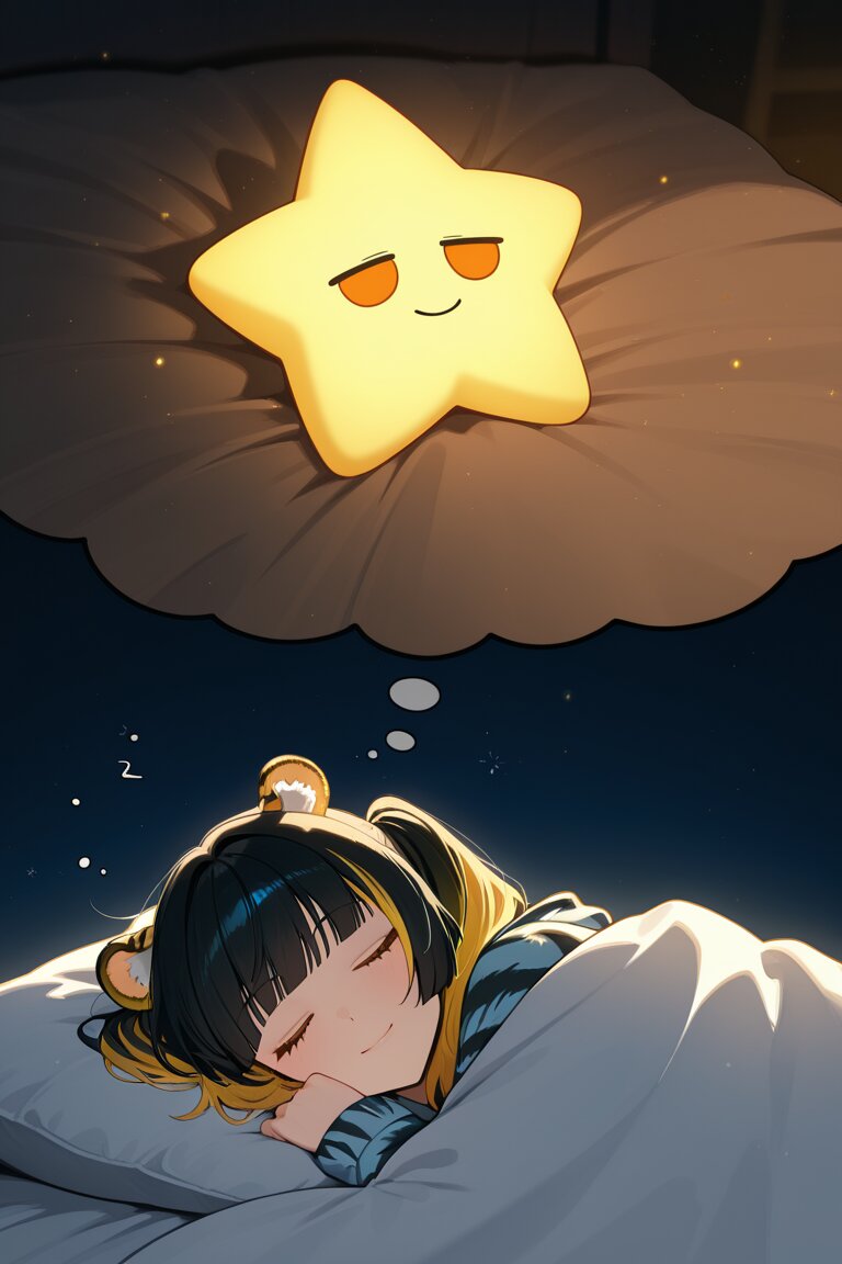 sleeping girl, multicolor hair, black hair, yellow hair, medium hair, twintails, blunt bangs, tiger ears, animal ears, orange eyes, tiger stripes, long sleeves pajama, closed eyes,peaceful, dreamy, soft blankets, gentle breeze, serene expression, curled up, tranquil atmosphere, comfortable bed, content smile, sleeping peacefully, calm surroundings, deep slumber,sleep bubble, (dreaming be a super star :1.2),masterpiece, best quality, amazing quality, very aesthetic, high resolution, ultra-detailed, absurdres, newest, 8k UHD