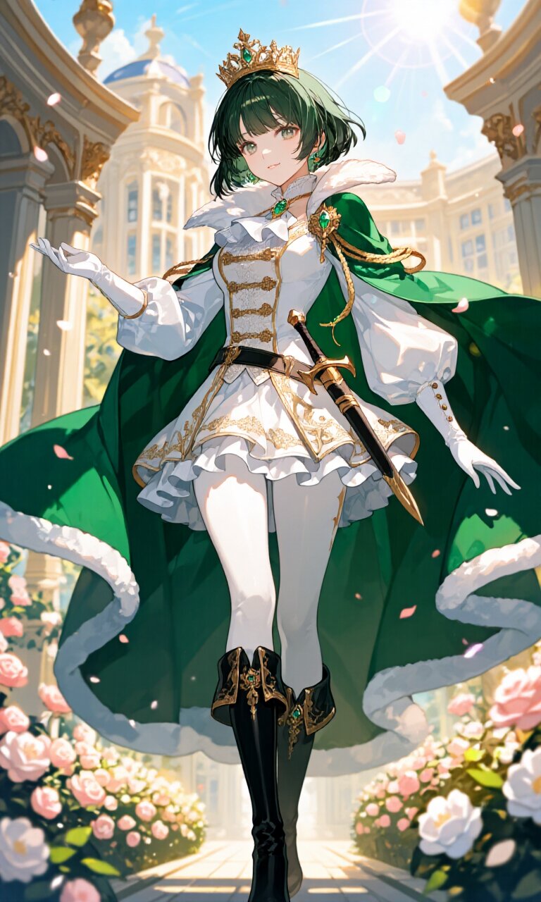 A 20-year-old young woman with short, dark green hair styled in an elegant bob stands in a regal pose outside a grand Rococo-style palace. Her beautiful face features delicate, symmetrical features with sparkling eyes and flawless, detailed skin. She wears an extravagant (White luxurious Prince costume:1.6) with elaborate gold embroidery, puffed (long sleeves), and an intricate (lace jabot) at the neck. The outfit is completed with a (luxurious Green Cape:1.3) flowing dramatically behind her, a (luxurious Green mini skirt:1.4) with layered ruffles, and (Black luxurious Boots:1.3) with gold accents over white tights. A (dagger on waist:1.3) hangs from her belt, and she wears a (luxurious crown on head:1.4) adorned with jewels along with (White luxurious gloves:1.2). The afternoon sunlight creates soft beams through the blooming flowers in the palace gardens, casting a romantic glow with lens flare effects. The background features ornate Rococo architecture with curved lines and gilded details, perfectly complementing the romantic academia aesthetic. Every element from her detailed hair strands to the fabric textures of her lavish costume is rendered with insanely detailed, 16k quality.
