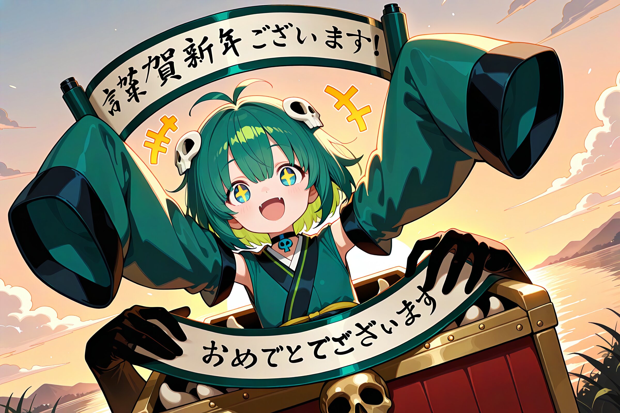1 little girl, solo, diagonal angle, upper body, masterpiece, best quality, amazing quality, very aesthetic, cobalt green hair, short hair, messy hair, (hair over eyes:0.8), demon fangs, +_+, open mouth, smile, cheerful, excited, +++, notice lines, choker, green kimono, sleeves past wrists, sleeves past fingers, (oversized sleeves:1.2), detached sleeves, skull hair ornament, in mimic chest, arms up straight, holding scroll, holding scroll, japanese text, handwritten text, happy new year, (floating black ghosty hands:1.2), sunrise, japanese patterned background,