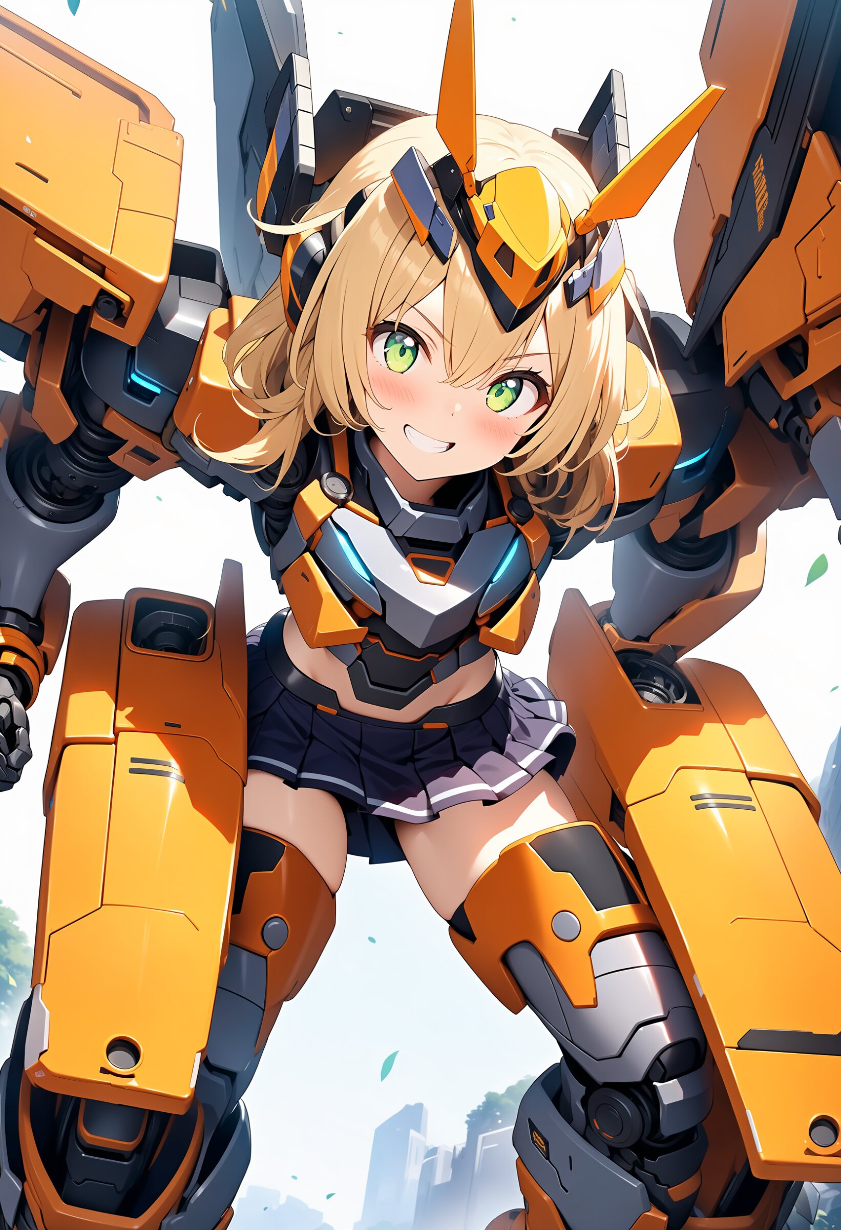 1girl, ((white background)), ultra detailed 8k cg render, masterpiece, high resolution, extremely detailed, mecha musume,mecha shoulder, mech leg, headgear, mecha armor, ((mini skirt)),long blonde hair, dropping green eyes, smile, dynamic posing,