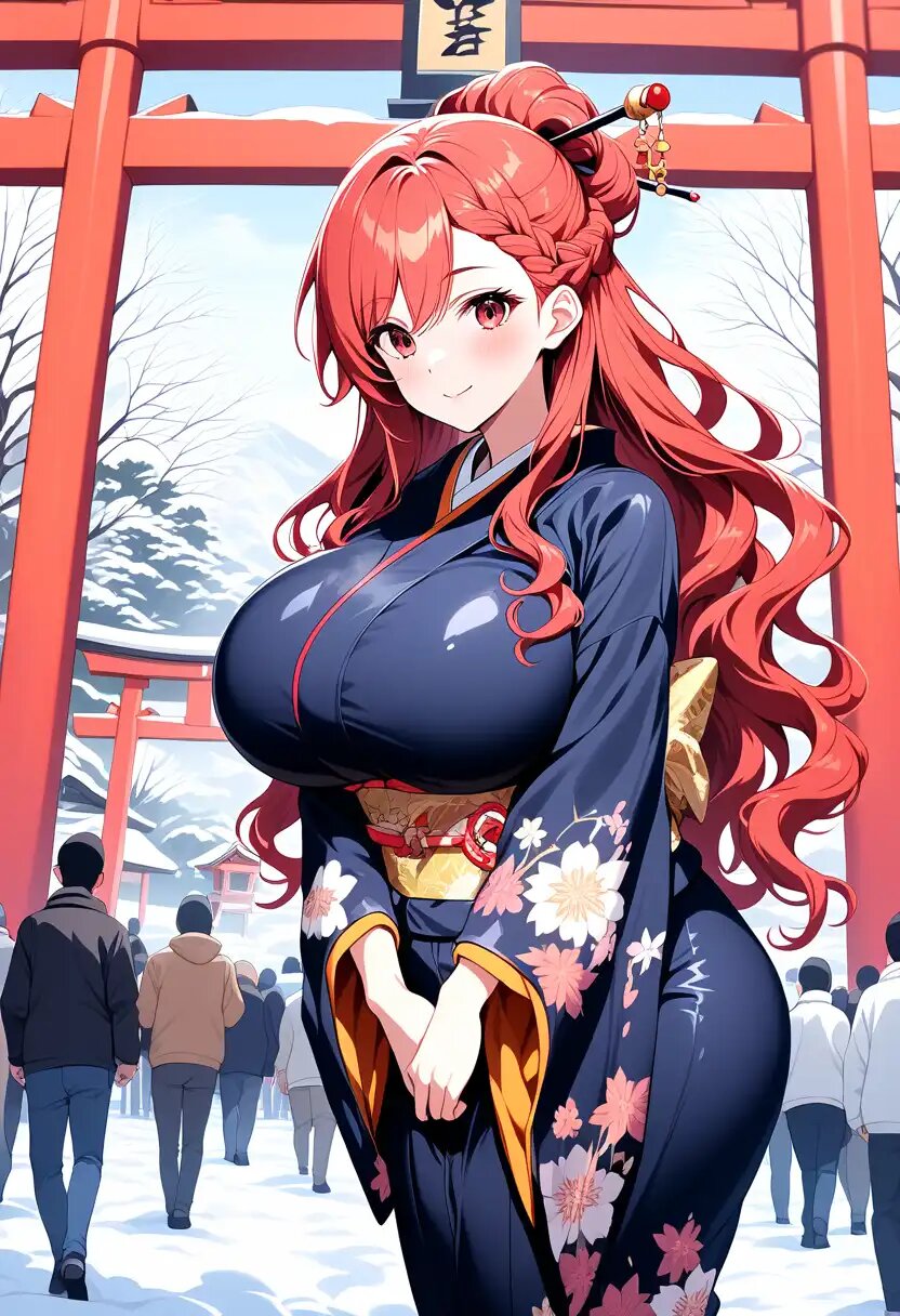 masterpiece, best quality, ultra detailed, 8K, [furisode]++, [hair stick]++, [huge breasts]++, perky breasts, hanging breasts, curvy, cowboy shot, tall, [long hair]++, [shiny]+, [shiny skin]+, [shiny clothes]+, smile, blush, closed mouth, standing, [legs together]++, [v arms]++, shrine, day, outdoors, [crowd]++, snow, winter, torii, [wavy hair]++,