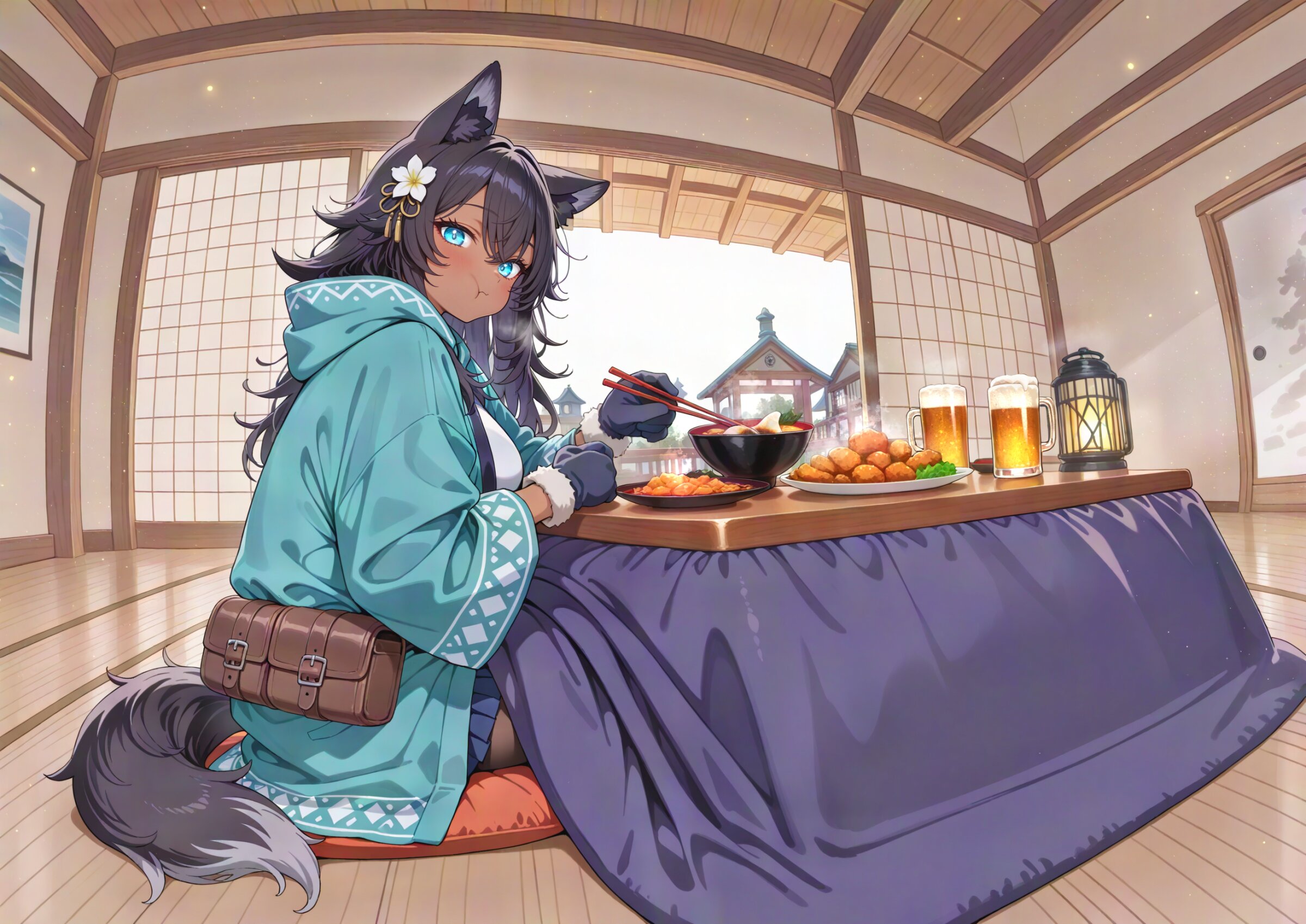 (fisheye,fisheye lens angle:1.0), (low angle shot:1.2) looking at viewer, medieval fantasy world, shouji, sliding doors, veranda, stone lantern, bar, A tavern filled with the constant din of adventurers, its interior lit by bright lantern light. crowd of fantasy warrior, background is multiple boys fantasy sitting round table, beer mug, 1girl, black wolf ears, dark skin, young beautiful girl, large breasts, tall, wolf tail, (aristocratic features), (Black Hair:1.2) (disheveled long hair over ears:1.3) messy hair ornament flower, (perfect turquoise eyes:1.3) long eyelashes,, wearing turquoise hood down, winter gloves, black lether miniskirt, belt boots, turquoise hoodie, hooded jacket, winter coat, fur boots, black pantyhose, belt bag,, eating zouni soup, holding chopsticks, sitting kotatsu, zabuton, hanten \(clothes\), puffy cheeks, fried chicken on plate, osechi, mochi, datemaki \(food\), cup of green tea, glass of champagne, heater, (morning:1.3), sunlight, super fine concept art, hard surface, 8K, unreal engine, masterpiece, best quality, amazing quality, very aesthetic, absurdres, you can add scenery, (volumetric lighting), To make the background more distinctive. professional art lots of details, , overexposure, shiny-glistening, (watercolor style:1.0), (pastel color style:1.0) 4ur4_illu,shiny, glowing, glowing particles, glowing light particles, light particles, <lora:noline (1):-0.5> <lora:sdxl2-flat2-512b:0.2> <lora:facelightup_xl_v10:0.5> <lora:V2_yakumo_alchemy:0.2> <lora:Aura_illu:0.1>