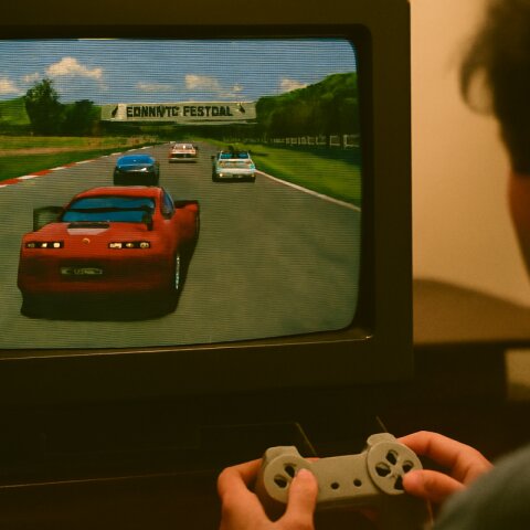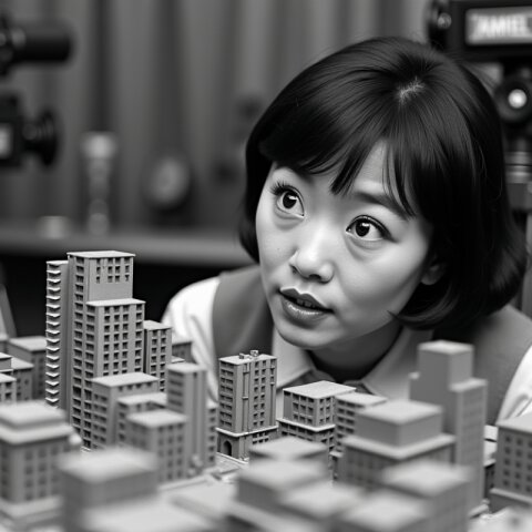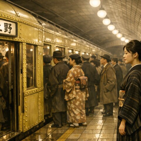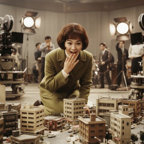 The Toyopet Crown was unveiled on January 7, 1955. Approximately 18,000 visitors gathered at the launch event, an unprecedented turnout for a new car unveiling at the time. She gazed at the Crown at the launch venue. She wore a small bag slung over her shoulder. She touched the hood of the Toyopet Crown while looking down. Her gaze was fixed on the Toyopet Crown, her eyes dreamy. People are dressed in 1950s fashion. The venue's atmosphere also features a classical design.