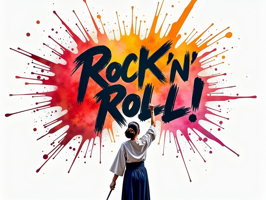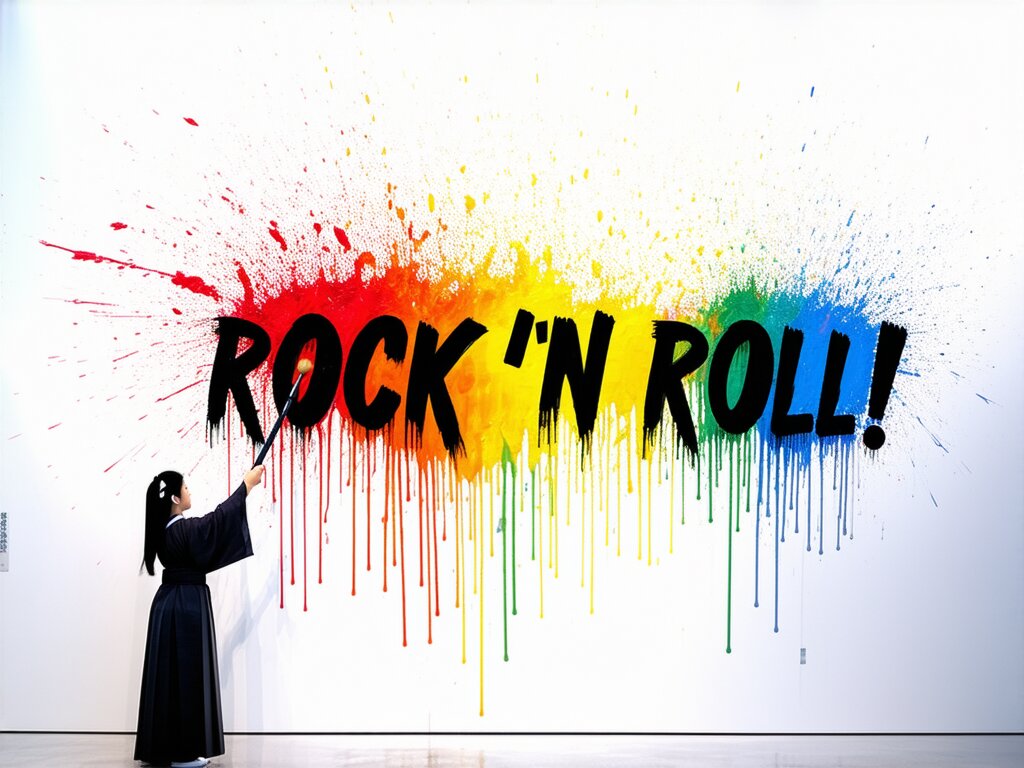 Vibrant paint explodes across a massive, pure white wall. The vivid, powerful explosion of paint spreads in radiating drips and streaks. Above it, a woman in hakama holds a brush as tall as herself, writing the words “ROCK ‘N’ ROLL!” in thick, black brush strokes. She tilts the letters diagonally, layering them over the paint with fierce, energetic strokes. This composition evokes rebellion, movement, and artistic chaos.