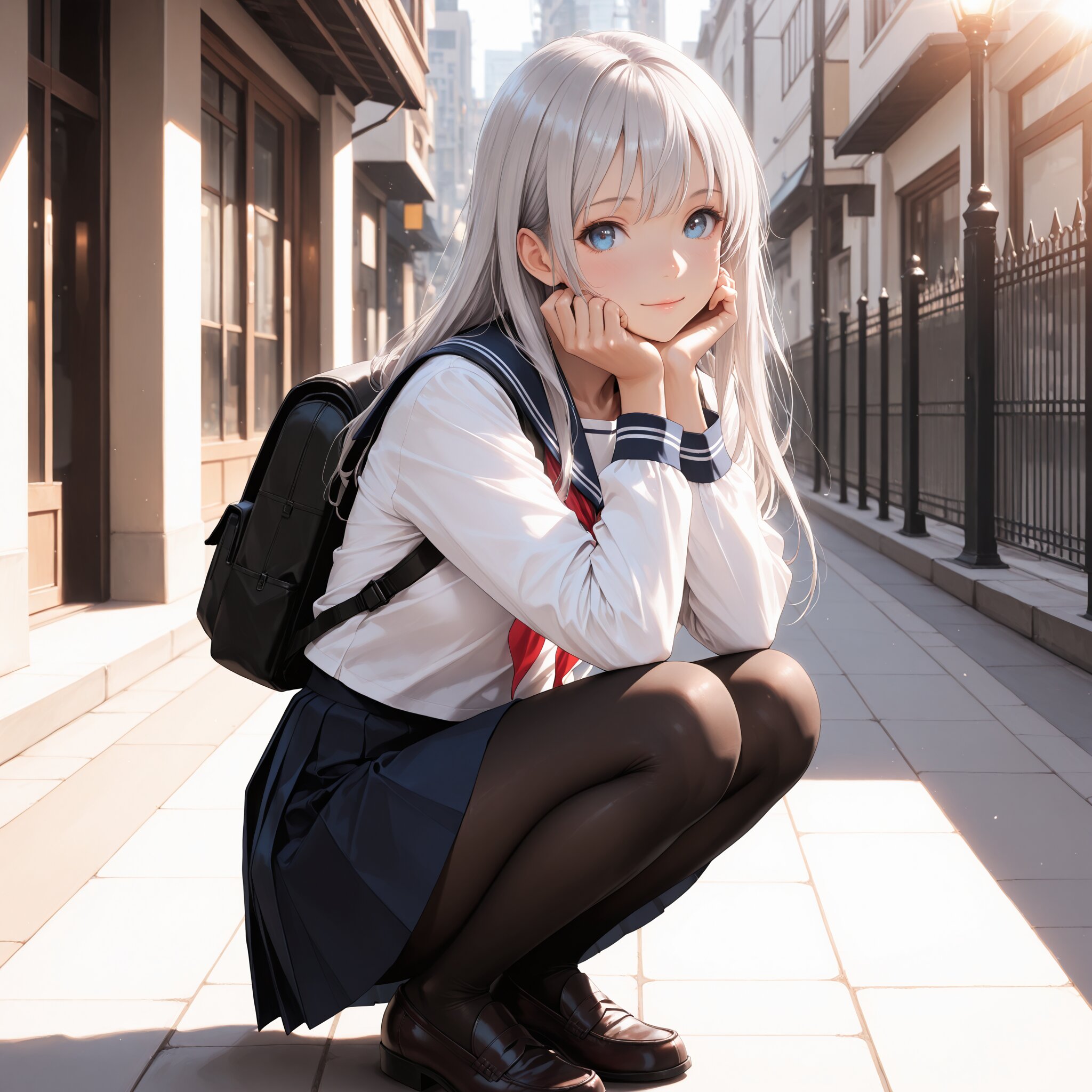 masterpiece, best quality, photorealistic, sharp focus, cinematic lighting, depth of field, beautiful composition, vibrant colors, ultra high res, 8K, highly detailed, masterpiece, best quality, very detailed, score_9, score_8_up, score_7_up, source_anime, 1girl, solo, silver hair, long hair, blue eyes, sailor uniform, white shirt, pleated skirt, red ribbon, black pantyhose, black tights, loafers, backpack, crouching, squatting, hand on cheek, leaning on hand, looking at viewer, slight smile, urban street background, sidewalk, fence, soft afternoon sunlight, cinematic lighting, masterpiece