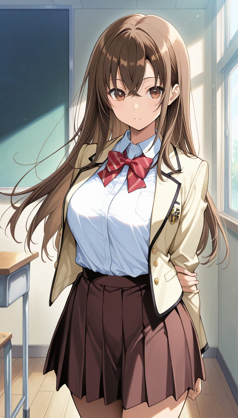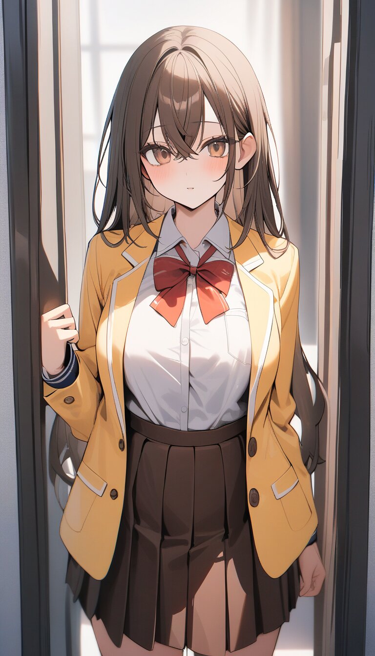 best quality,absurdres,8k,ultra detailed,very aesthetic,1girl,(rating: general:1.2), 1girl, solo, brown hair, straight hair, cross bangs, brown eyes, breasts, school uniform, white shirts, light yellow bolero jacket, red school ribbon, brown skirt,