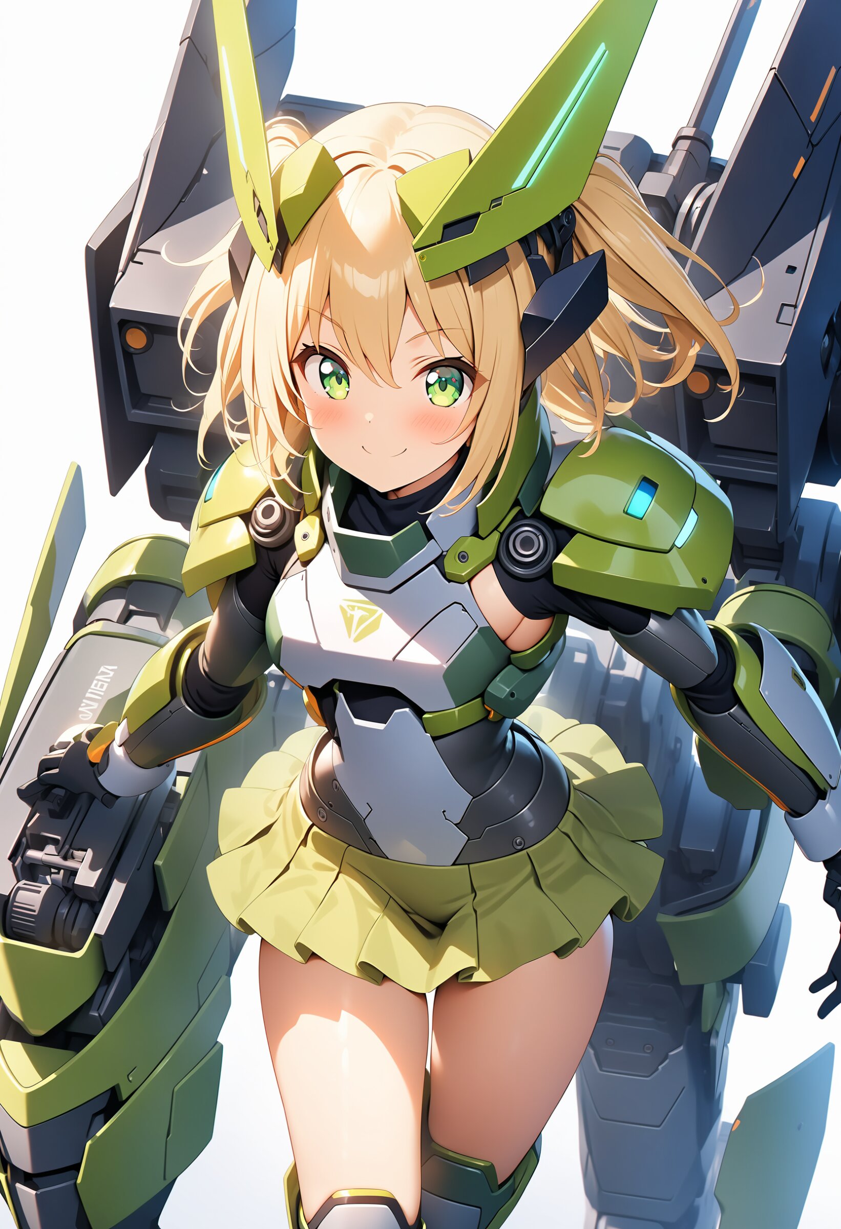 1girl, ((white background)), ultra detailed 8k cg render, masterpiece, high resolution, extremely detailed, mecha musume,mecha shoulder, mech leg, headgear, mecha armor, ((mini skirt)),long blonde hair, dropping green eyes, smile, dynamic posing,