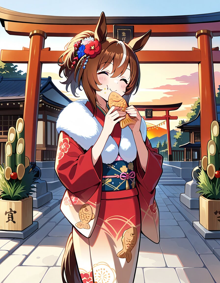 1girl, solo,(horse_girl:1.3), horse_ears, horse_tail, long_ponytail, brown_hair, (extremely_happy_smile:1.4), (eating_while_walking:1.4), (holding_food:1.3), (taiyaki:1.2), (mouth_full:1.2), (traditional_kimono:1.2), fur_shawl, japanese_shrine, (new_year_decorations:1.2), kadomatsu, torii, sunset_lighting, relaxed_atmosphere, carefree, (masterpiece:1.2), best_quality, amazing_quality, very_aesthetic, high_score, newest
