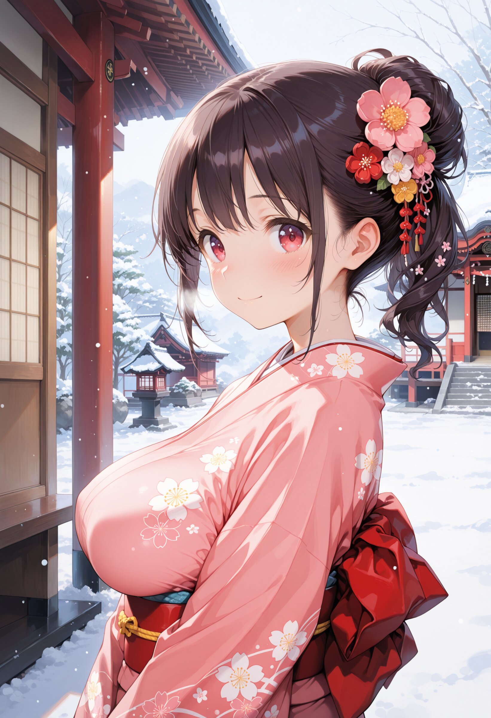 masterpiece, best quality, highres, ultra-detailed, extremely detailed, detailed, 1girl, loli, beautiful hair, beautiful eyes, Flower hair ornament, kimono, big breasts, impossible clothes, perky breasts, Japanese shrine, innocent expression, happy, snow, from side,