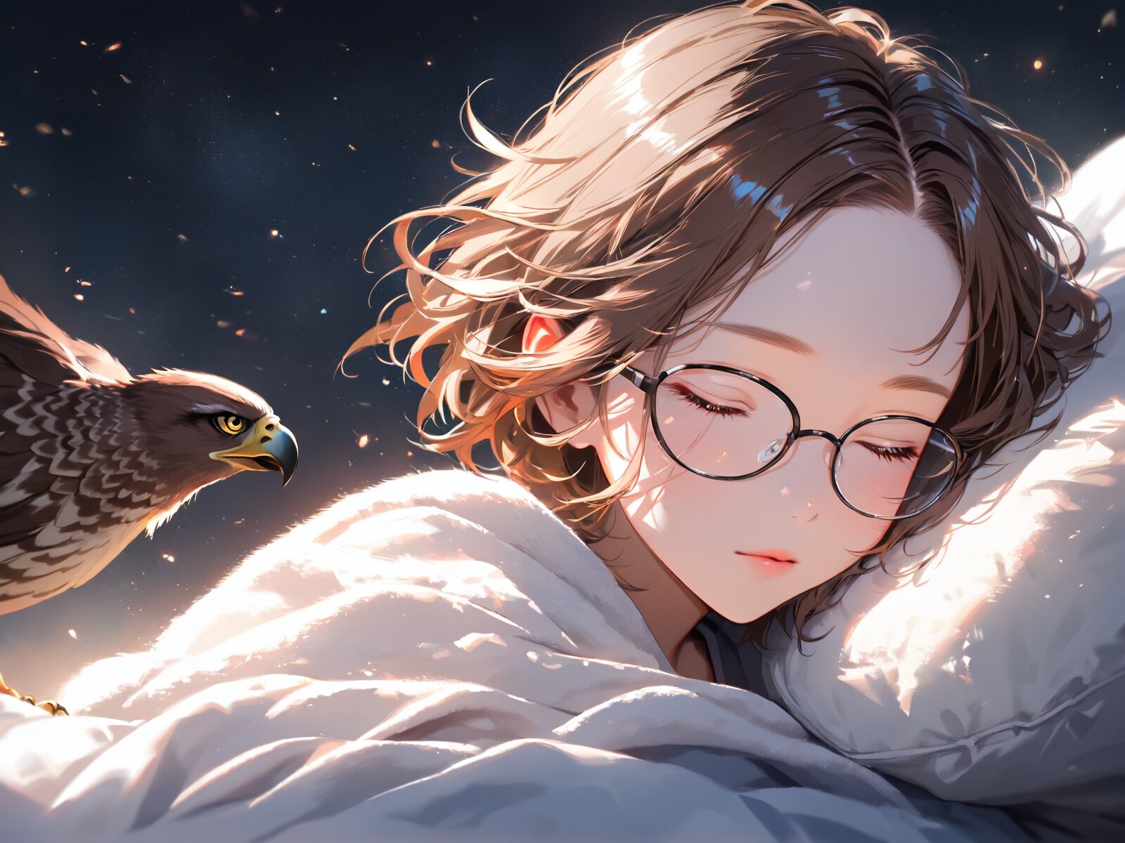 solo, Dreaming of hawk, closed eyes, pajamas, comforter, forehead, glasses, brown hair, short hair,