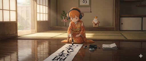 Wide composition, cinematic, ultra-detailed, serene Japanese atmosphere. A quiet Japanese room just after year-end cleaning, prepared for the New Year. The wooden floor is polished and reflects soft morning light. Shoji doors gently filter golden sunlight, creating calm shadows. A simple tokonoma alcove displays a pine decoration and kagami mochi. At the center, Zena is sitting in seiza, doing kakizome (Japanese New Year calligraphy). She holds a traditional brush with both hands, calmly writing bold black ink characters on white washi paper. The calligraphy clearly reads: 「開運AI生活」 Ink strokes are powerful yet graceful, slightly bleeding into the paper fibers. Zena is small within the scene, harmonizing with the space. She has orange bob hair, wears her signature headphones, and is dressed in an elegant orange-and-gold kimono, subtly modernized with shoulder slits. Small monkey ears are visible, symbolizing the zodiac. Beside her are an ink stone, ink stick, water dropper, and folded paper, all neatly arranged. The air feels purified, silent, and sacred — a moment of intention and prayer. The overall mood expresses: "Ichisouji Nishinshin" — cleaning first, faith second. A peaceful beginning of a lucky new year. Ultra-detailed background, delicate textures, soft light, Japanese anime cinematic style, spiritual calm, refined harmony.