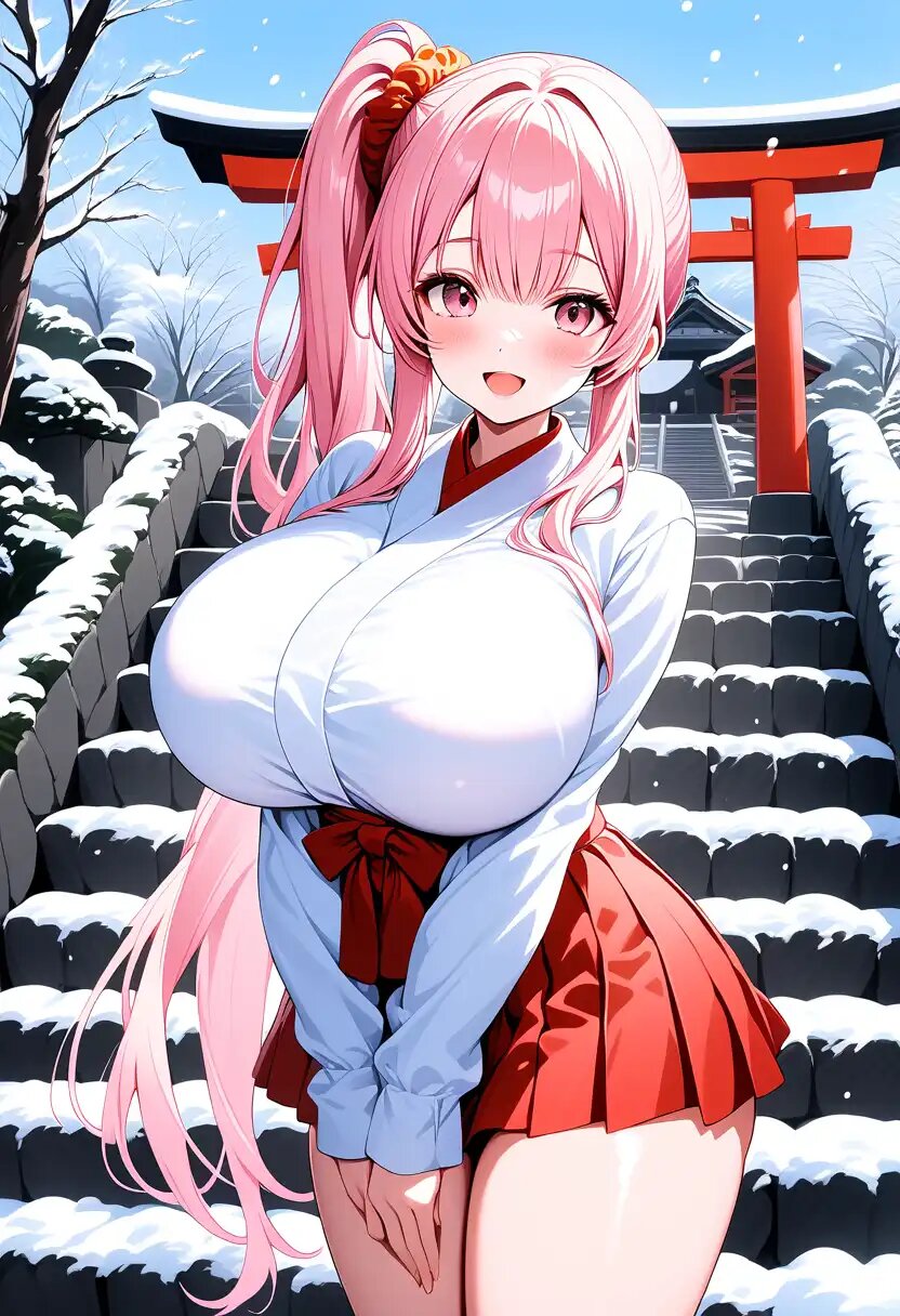 masterpiece, best quality, ultra detailed, 8K, [miko]++, [miniskirt]++, [huge breasts]++, perky breasts, hanging breasts, curvy, long sleeves, bare legs, cowboy shot, [v arms]++, hair scrunchie, standing, [legs together]++, tall, [long hair]++, [straight hair]++, [shiny]+, [shiny skin]+, [shiny clothes]+, smile, blush, open mouth, shrine, outdoors, snow, day, torii, stone stairs, [high side ponytail]++,