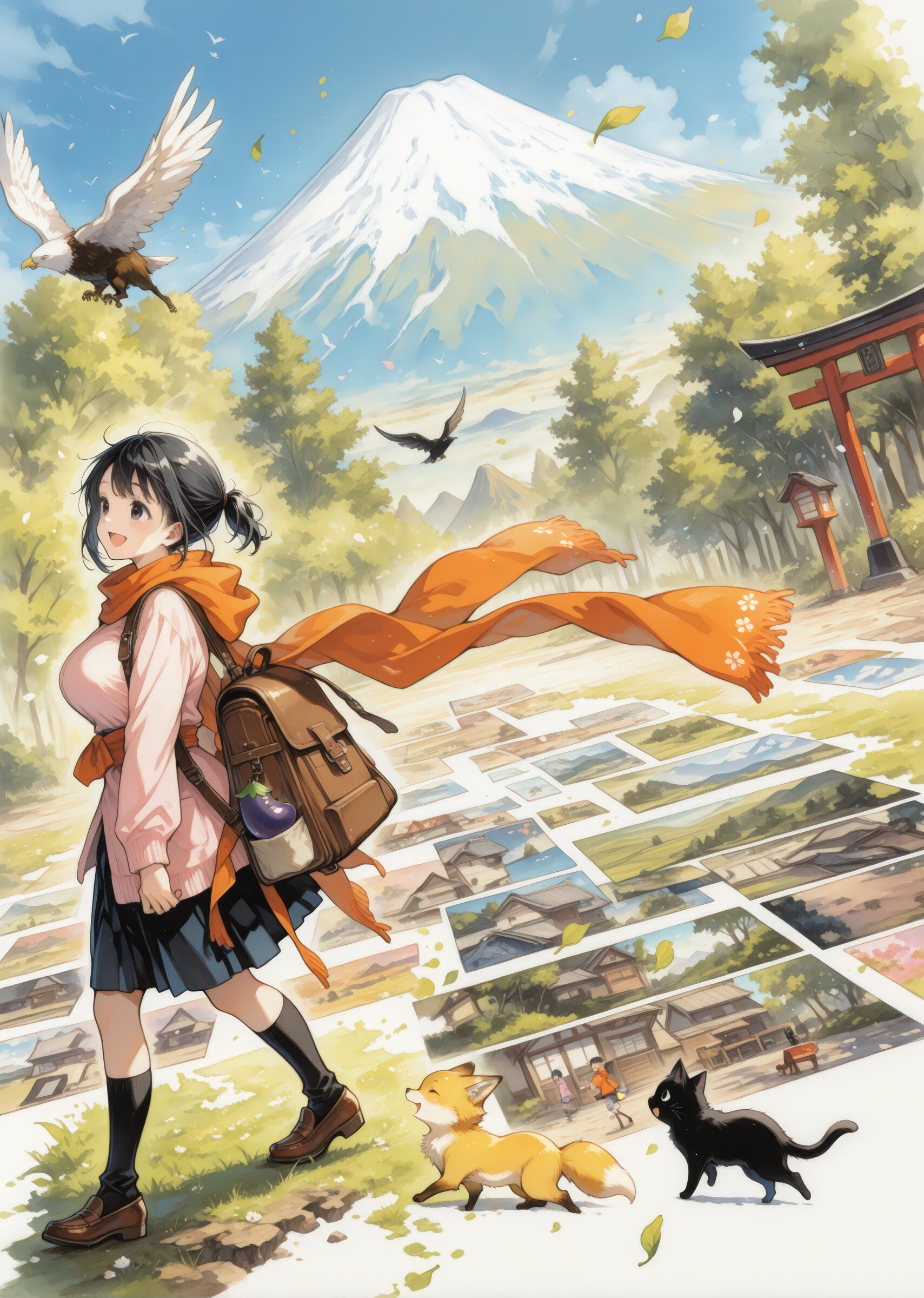 Masterpiece, Best quality, A soft watercolor-style illustration featuring gentle, painted textures and pastel tones, creating a dreamy and delicate atmosphere, nostalgic mood, Mount Fuji in the background, an eagle soaring through the sky, a girl walking sideways, a flying eggplant, 1girl, (young girl), cute face and eyes, big breasts, black hair, clear black eyes, single short ponytail hair, cute and lovely, Vigorous, lively, and spontaneous personality, smile, open mouth, happy, cute small fox cub, a black cat, ((from side)), soft blur, white background, negative space, scattering of cherished photographs, assemblage, concept art, professional illustration,