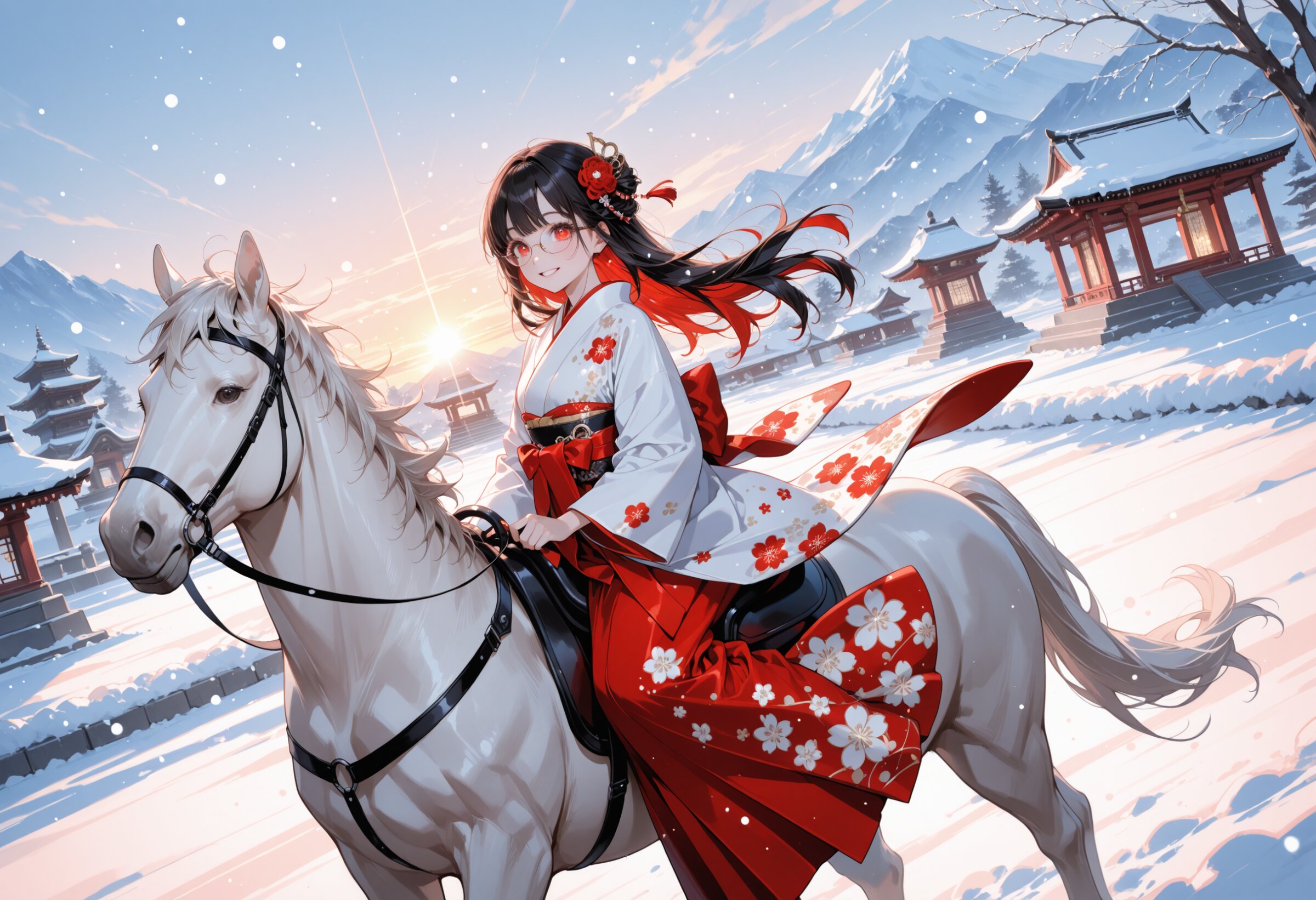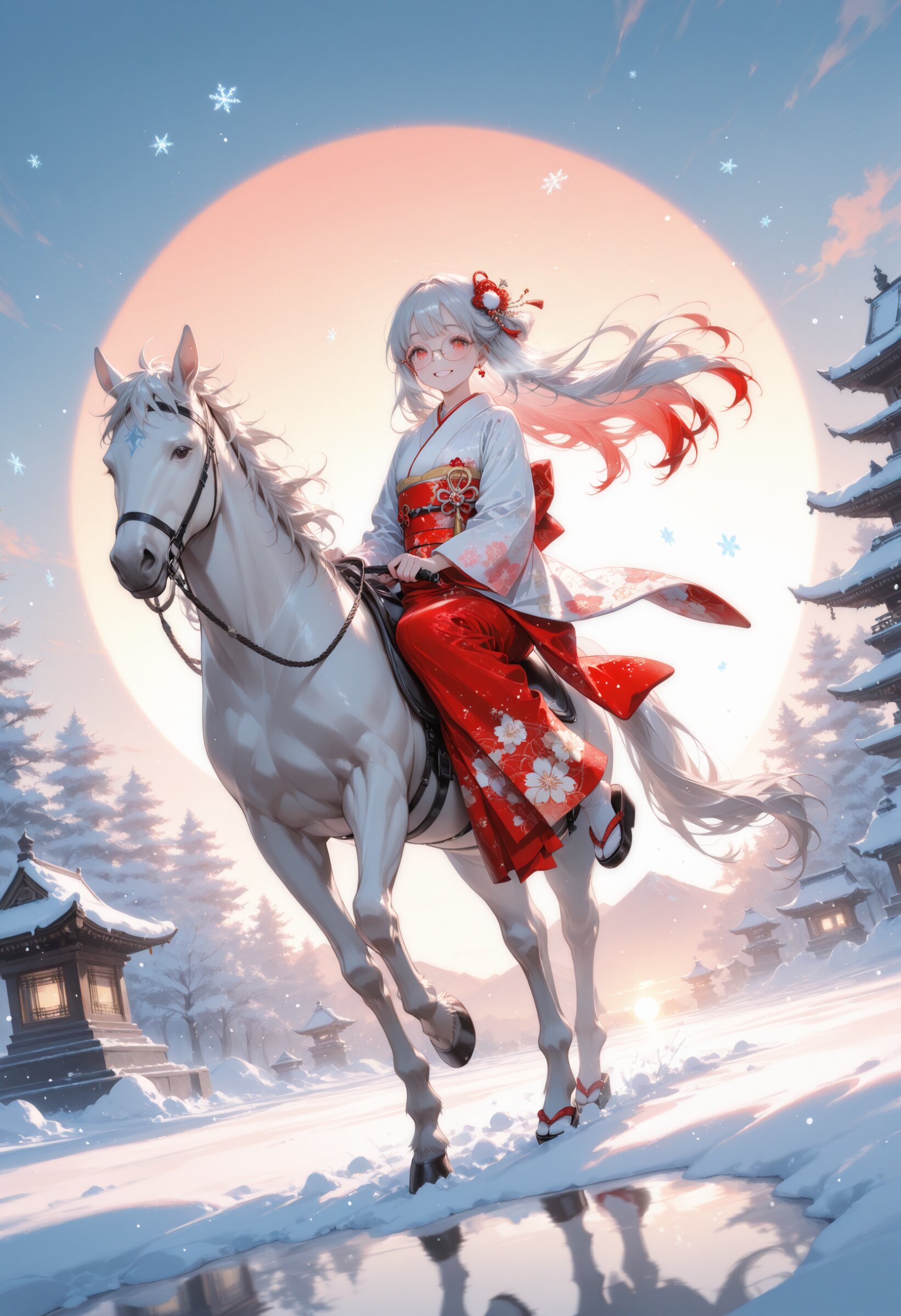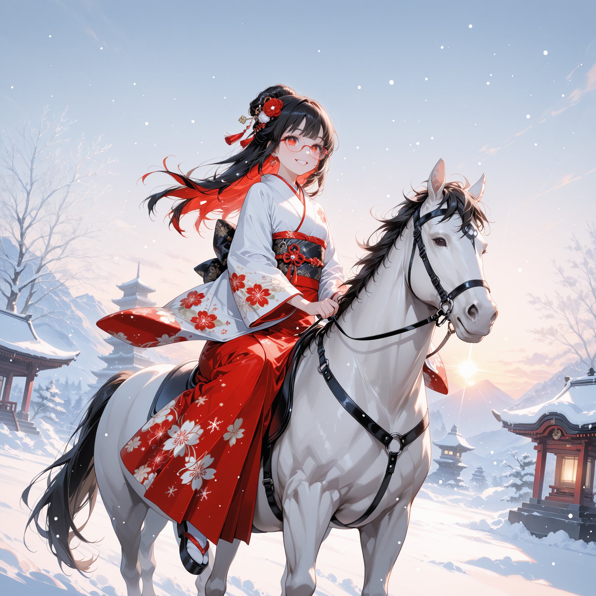 (rating: sensitive:1.2), score_9, score_8_up, score_7_up, score_6_up, NSFW, source_anime, (delicate illustration), (pastel color style illustration, flat colors), (perspective, super dynamic angle from side), diagonal view. 1 girl with glasses, dressed in random color kimono, Japanese kimono, floral pattern, furisode, wide sleeves, long sleeves, hair ornaments, horseback riding, sunrise, dawn, winter, temple, realistic background, glowing particles, glowing, reflection, (New Year illustration, red and white theme, ultra-intricate detailed), elegant, flat design, bold colors, patterned fabric, beautiful composition, BREAK insanely beautiful and perfect kimono, intricately shiny hair, beautiful small face, big round eyes, highly detailed eyes, long eyelashes, double eyelids, smile, kawaii, cute, flat chest, slender, exquisitely detailed clothes, perfect anatomy, dynamic angle, dynamic pose. BREAK (DOF), sharp focus on the girl, emphasizing depth, intricate background, intricate details, (snow falling, snowflakes, particles of light, divine light). BREAK perfect AI rendering, three-quarter view. BREAK (masterpiece, aesthetic quality, 8K, ultra-detailed), whimsical color palette, perfect design, amazing quality, high quality, absurdres, highres, natural lighting,