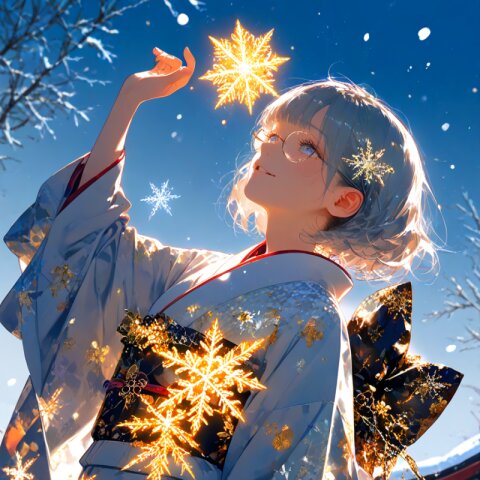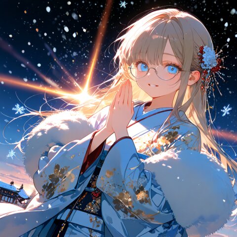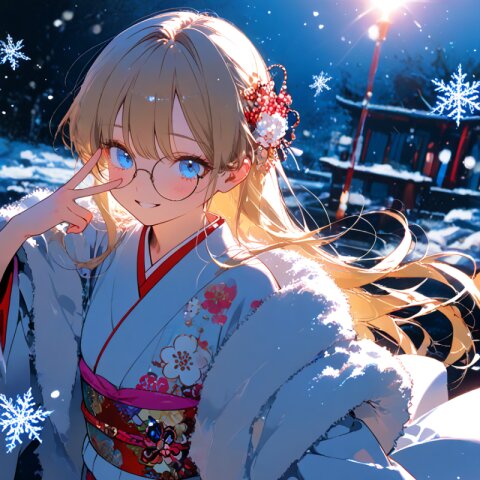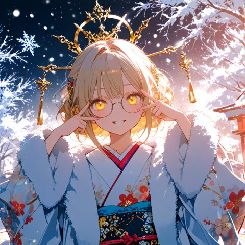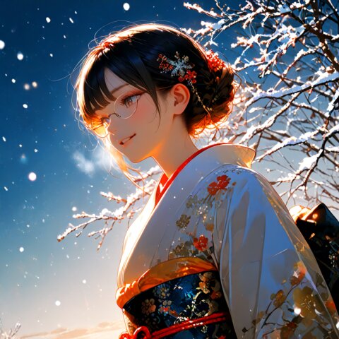 (rating: sensitive:1.2), score_9, score_8_up, score_7_up, score_6_up, NSFW, source_anime, (delicate illustration), (pastel color style illustration, flat colors), (perspective, super dynamic angle from side), diagonal view. 1 girl with glasses, dressed in random color kimono, Japanese kimono, floral pattern, furisode, wide sleeves, long sleeves, hair ornaments, horseback riding, sunrise, dawn, winter, temple, realistic background, glowing particles, glowing, reflection, (New Year illustration, red and white theme, ultra-intricate detailed), elegant, flat design, bold colors, patterned fabric, beautiful composition, BREAK insanely beautiful and perfect kimono, intricately shiny hair, beautiful small face, big round eyes, highly detailed eyes, long eyelashes, double eyelids, smile, kawaii, cute, flat chest, slender, exquisitely detailed clothes, perfect anatomy, dynamic angle, dynamic pose. BREAK (DOF), sharp focus on the girl, emphasizing depth, intricate background, intricate details, (snow falling, snowflakes, particles of light, divine light). BREAK perfect AI rendering, three-quarter view. BREAK (masterpiece, aesthetic quality, 8K, ultra-detailed), whimsical color palette, perfect design, amazing quality, high quality, absurdres, highres, natural lighting,